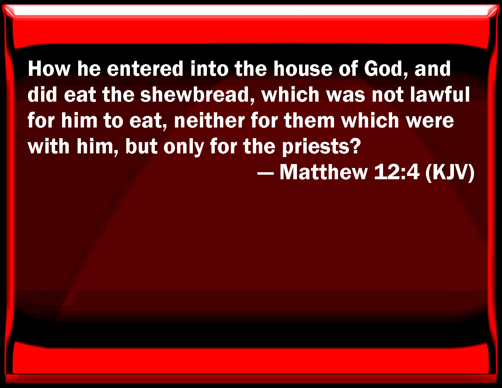 Bible Verse Slide Matthew 12:4 How he entered into the house of God, and did eat the show bread, which was not lawful for him to eat, neither for them which were with him, but only for the priests? KJV: How he entered into the house of God, and did eat the shewbread, which was not lawful for him to eat, neither for them which were with him, but only for the priests? DRB: How he entered into the house of God, and did eat the loaves of proposition, which it was not lawful for him to eat, nor for them that were with him, but for the priests only? DBT: How he entered into the house of God, and ate the shewbread, which it was not lawful for him to eat, nor for those with him, but for the priests only? ERV: how be entered into the house of God, and did eat the shewbread, which it was not lawful for him to eat, neither for them that were with him, but only for the priests? WBT: How he entered into the house of God, and ate the show-bread, which it was not lawful for him to eat, neither for them who were with him, but only for the priests? WEB: how he entered into the house of God, and ate the show bread, which was not lawful for him to eat, neither for those who were with him, but only for the priests? YLT: how he went into the house of God, and the loaves of the presentation did eat, which it is not lawful to him to eat, nor to those with him, except to the priests alone?Links Matthew 12:4 NIV • Matthew 12:4 NLT • Matthew 12:4 ESV • Matthew 12:4 NASB • Matthew 12:4 KJV • Matthew 12:4 Interlinear • Matthew 12:4 Commentaries • Matthew 12:4 Parallel Texts • Matthew 12:4 Bible Apps • Matthew 12:4 Parallel • Bible Hub |