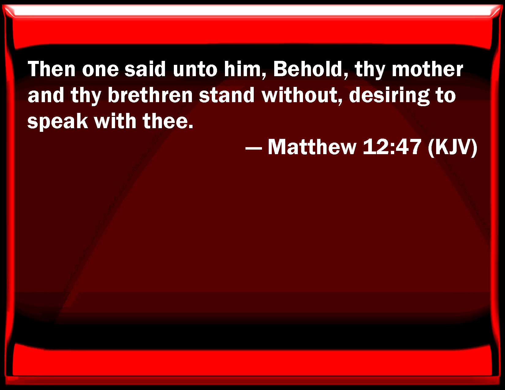 Bible Verse Slide Matthew 12:47 Then one said to him, Behold, your mother and your brothers stand without, desiring to speak with you. KJV: Then one said unto him, Behold, thy mother and thy brethren stand without, desiring to speak with thee. DRB: And one said unto him: Behold thy mother and thy brethren stand without, seeking thee. DBT: Then one said unto him, Behold, thy mother and thy brethren are standing without, seeking to speak to thee. ERV: And one said unto him, Behold, thy mother and thy brethren stand without, seeking to speak to thee. WBT: Then one said to him, Behold, thy mother and thy brethren stand without, desiring to speak with thee. WEB: One said to him, "Behold, your mother and your brothers stand outside, seeking to speak to you." YLT: and one said to him, 'Lo, thy mother and thy brethren do stand without, seeking to speak to thee.'Links Matthew 12:47 NIV • Matthew 12:47 NLT • Matthew 12:47 ESV • Matthew 12:47 NASB • Matthew 12:47 KJV • Matthew 12:47 Interlinear • Matthew 12:47 Commentaries • Matthew 12:47 Parallel Texts • Matthew 12:47 Bible Apps • Matthew 12:47 Parallel • Bible Hub |
