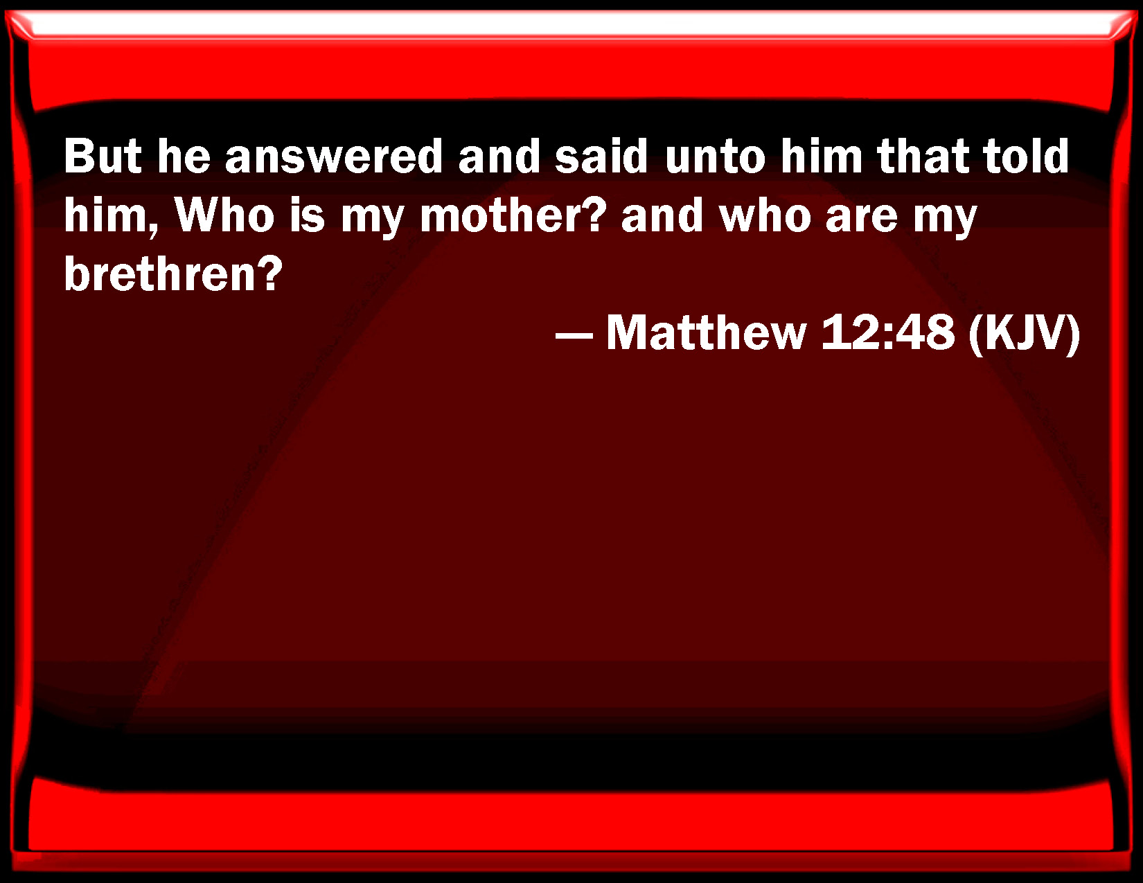 Bible Verse Slide Matthew 12:48 But he answered and said to him that told him, Who is my mother? and who are my brothers? KJV: But he answered and said unto him that told him, Who is my mother? and who are my brethren? DRB: But he answering him that told him, said: Who is my mother, and who are my brethren? DBT: But he answering said to him that spoke to him, Who is my mother, and who are my brethren? ERV: But he answered and said unto him that told him, Who is my mother? and who are my brethren? WBT: But he answered and said to him that told him, Who is my mother? and who are my brethren? WEB: But he answered him who spoke to him, "Who is my mother? Who are my brothers?" YLT: And he answering said to him who spake to him, 'Who is my mother? and who are my brethren?'Links Matthew 12:48 NIV • Matthew 12:48 NLT • Matthew 12:48 ESV • Matthew 12:48 NASB • Matthew 12:48 KJV • Matthew 12:48 Interlinear • Matthew 12:48 Commentaries • Matthew 12:48 Parallel Texts • Matthew 12:48 Bible Apps • Matthew 12:48 Parallel • Bible Hub |