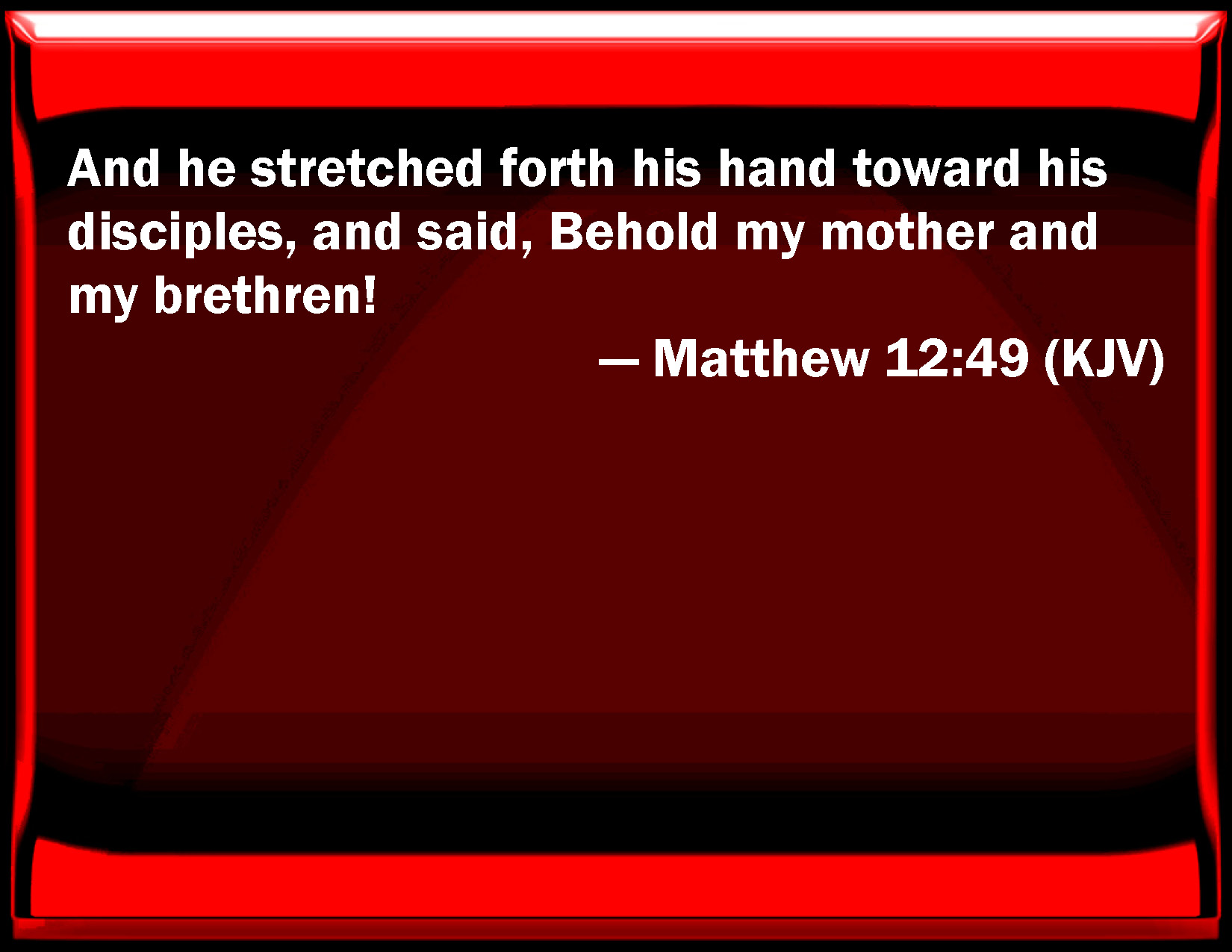 Bible Verse Slide Matthew 12:49 And he stretched forth his hand toward his disciples, and said, Behold my mother and my brothers! KJV: And he stretched forth his hand toward his disciples, and said, Behold my mother and my brethren! DRB: And stretching forth his hand towards his disciples, he said: Behold my mother and my brethren. DBT: And, stretching out his hand to his disciples, he said, Behold my mother and my brethren; ERV: And he stretched forth his hand towards his disciples, and said, Behold, my mother and my brethren! WBT: And he stretched forth his hand towards his disciples, and said, Behold my mother and my brethren! WEB: He stretched out his hand towards his disciples, and said, "Behold, my mother and my brothers! YLT: And having stretched forth his hand toward his disciples, he said, 'Lo, my mother and my brethren!Links Matthew 12:49 NIV • Matthew 12:49 NLT • Matthew 12:49 ESV • Matthew 12:49 NASB • Matthew 12:49 KJV • Matthew 12:49 Interlinear • Matthew 12:49 Commentaries • Matthew 12:49 Parallel Texts • Matthew 12:49 Bible Apps • Matthew 12:49 Parallel • Bible Hub |