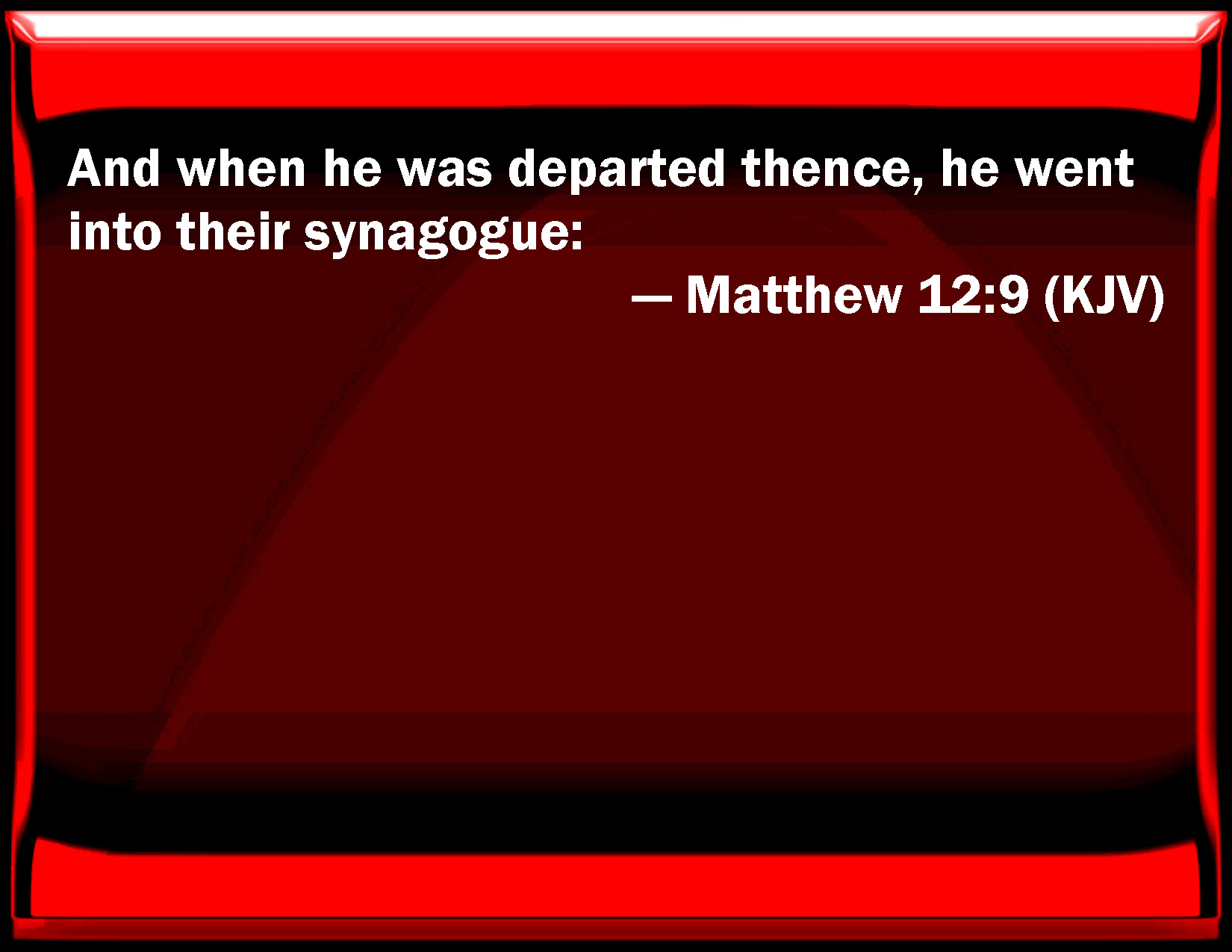 Bible Verse Slide Matthew 12:9 And when he was departed there, he went into their synagogue: KJV: And when he was departed thence, he went into their synagogue: DRB: And when he has passed from thence, he came into their synagogues. DBT: And, going away from thence, he came into their synagogue. ERV: And he departed thence, and went into their synagogue: WBT: And when he had departed thence, he went into their synagogue. WEB: He departed there, and went into their synagogue. YLT: And having departed thence, he went to their synagogue,Links Matthew 12:9 NIV • Matthew 12:9 NLT • Matthew 12:9 ESV • Matthew 12:9 NASB • Matthew 12:9 KJV • Matthew 12:9 Interlinear • Matthew 12:9 Commentaries • Matthew 12:9 Parallel Texts • Matthew 12:9 Bible Apps • Matthew 12:9 Parallel • Bible Hub |