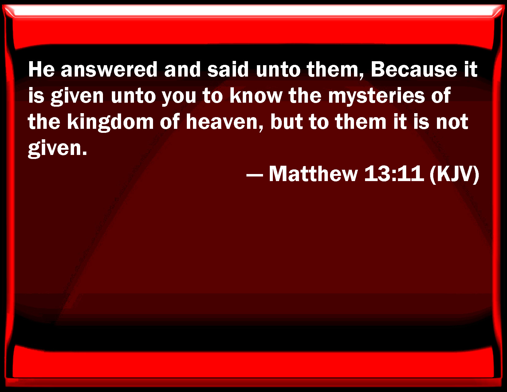 Bible Verse Slide Matthew 13:11 He answered and said to them, Because it is given to you to know the mysteries of the kingdom of heaven, but to them it is not given. KJV: He answered and said unto them, Because it is given unto you to know the mysteries of the kingdom of heaven, but to them it is not given. DRB: Who answered and said to them: Because to you it is given to know the mysteries of the kingdom of heaven: but to them it is not given. DBT: And he answering said to them, Because to you it is given to know the mysteries of the kingdom of the heavens, but to them it is not given; ERV: And he answered and said unto them, Unto you it is given to know the mysteries of the kingdom of heaven, but to them it is not given. WBT: He answered and said to them, Because it is given to you to know the mysteries of the kingdom of heaven, but to them it is not given. WEB: He answered them, "To you it is given to know the mysteries of the Kingdom of Heaven, but it is not given to them. YLT: And he answering said to them that — 'To you it hath been given to know the secrets of the reign of the heavens, and to these it hath not been given,Links Matthew 13:11 NIV • Matthew 13:11 NLT • Matthew 13:11 ESV • Matthew 13:11 NASB • Matthew 13:11 KJV • Matthew 13:11 Interlinear • Matthew 13:11 Commentaries • Matthew 13:11 Parallel Texts • Matthew 13:11 Bible Apps • Matthew 13:11 Parallel • Bible Hub |