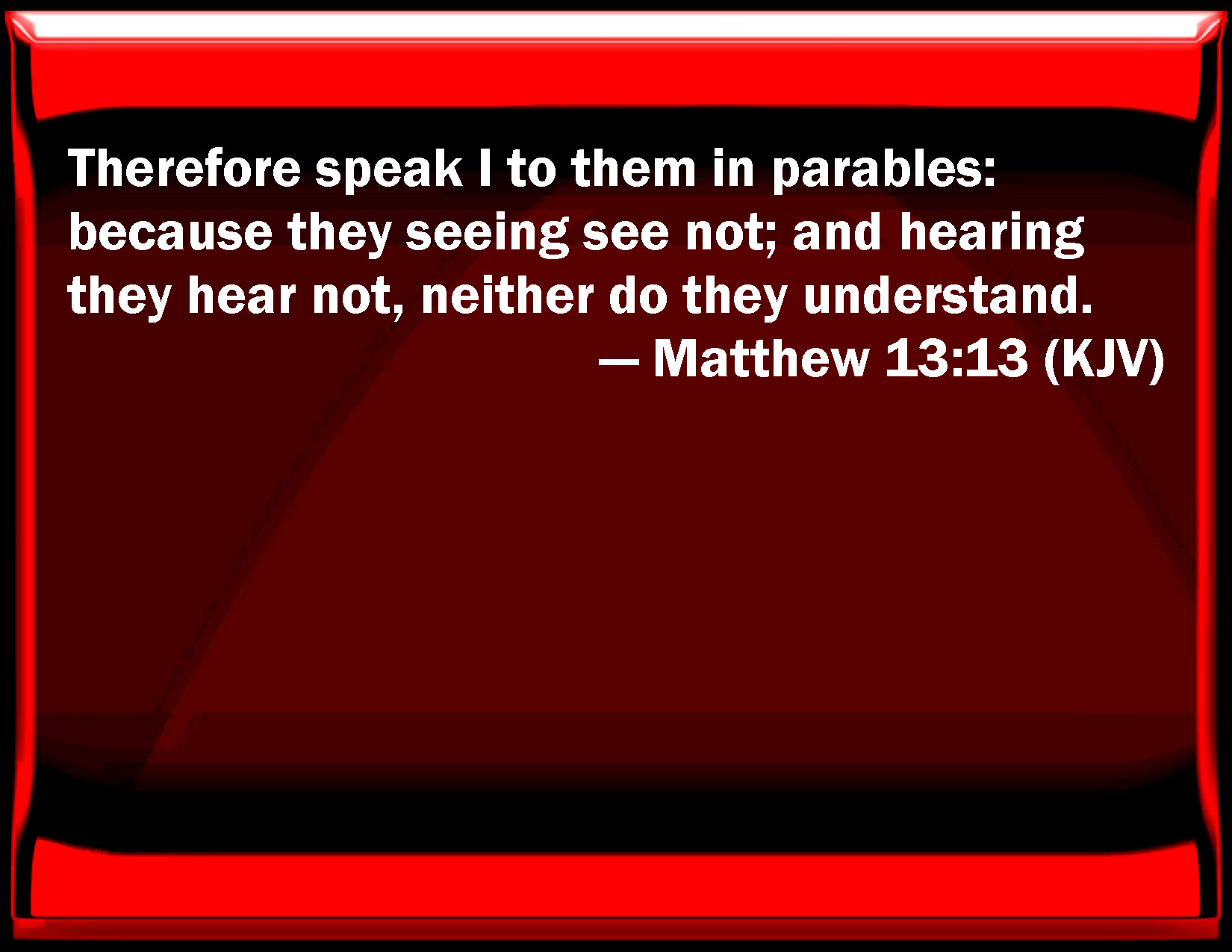 Bible Verse Slide Matthew 13:13 Therefore speak I to them in parables: because they seeing see not; and hearing they hear not, neither do they understand. KJV: Therefore speak I to them in parables: because they seeing see not; and hearing they hear not, neither do they understand. DRB: Therefore do I speak to them in parables: because seeing they see not, and hearing they hear not, neither do they understand. DBT: For this cause I speak to them in parables, because seeing they do not see, and hearing they do not hear nor understand; ERV: Therefore speak I to them in parables; because seeing they see not, and hearing they hear not, neither do they understand. WBT: Therefore I speak to them in parables: because they seeing see not; and hearing they hear not, neither do they understand. WEB: Therefore I speak to them in parables, because seeing they don't see, and hearing, they don't hear, neither do they understand. YLT: 'Because of this, in similes do I speak to them, because seeing they do not see, and hearing they do not hear, nor understand,Links Matthew 13:13 NIV • Matthew 13:13 NLT • Matthew 13:13 ESV • Matthew 13:13 NASB • Matthew 13:13 KJV • Matthew 13:13 Interlinear • Matthew 13:13 Commentaries • Matthew 13:13 Parallel Texts • Matthew 13:13 Bible Apps • Matthew 13:13 Parallel • Bible Hub |