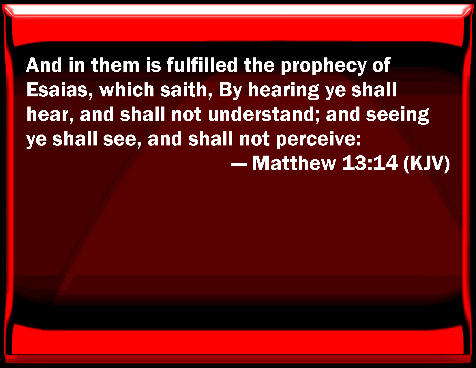 Bible Verse Slide Matthew 13:14 And in them is fulfilled the prophecy of Esaias, which said, By hearing you shall hear, and shall not understand; and seeing you shall see, and shall not perceive: KJV: And in them is fulfilled the prophecy of Esaias, which saith, By hearing ye shall hear, and shall not understand; and seeing ye shall see, and shall not perceive: DRB: And the prophecy of Isaias is fulfilled in them, who saith: By hearing you shall hear, and shall not understand: and seeing you shall see, and shall not perceive. DBT: and in them is filled up the prophecy of Esaias, which says, Hearing ye shall hear and shall not understand, and beholding ye shall behold and not see; ERV: And unto them is fulfilled the prophecy of Isaiah, which saith, By hearing ye shall hear, and shall in no wise understand; And seeing ye shall see, and shall in no wise perceive: WBT: And in them is fulfilled the prophecy of Isaiah, which saith, By hearing ye shall hear, and shall not understand; and seeing ye shall see, and shall not perceive: WEB: In them the prophecy of Isaiah is fulfilled, which says, 'By hearing you will hear, and will in no way understand; Seeing you will see, and will in no way perceive: YLT: and fulfilled on them is the prophecy of Isaiah, that saith, With hearing ye shall hear, and ye shall not understand, and seeing ye shall see, and ye shall not perceive,Links Matthew 13:14 NIV • Matthew 13:14 NLT • Matthew 13:14 ESV • Matthew 13:14 NASB • Matthew 13:14 KJV • Matthew 13:14 Interlinear • Matthew 13:14 Commentaries • Matthew 13:14 Parallel Texts • Matthew 13:14 Bible Apps • Matthew 13:14 Parallel • Bible Hub |
