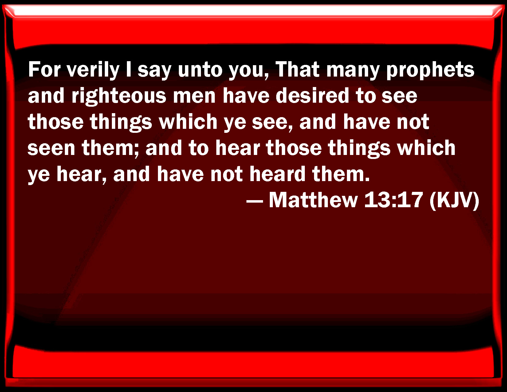 Bible Verse Slide Matthew 13:17 For truly I say to you, That many prophets and righteous men have desired to see those things which you see, and have not seen them; and to hear those things which you hear, and have not heard them. KJV: For verily I say unto you, That many prophets and righteous men have desired to see those things which ye see, and have not seen them; and to hear those things which ye hear, and have not heard them. DRB: For, amen, I say to you, many prophets and just men have desired to see the things that you see, and have not seen them, and to hear the things that you hear and have not heard them. DBT: for verily I say unto you, that many prophets and righteous men have desired to see the things which ye behold and did not see them, and to hear the things which ye hear and did not hear them. ERV: For verily I say unto you, that many prophets and righteous men desired to see the things which ye see, and saw them not; and to hear the things which ye hear, and heard them not. WBT: For verily I say to you, That many prophets and righteous men have desired to see the things which ye see, and have not seen them; and to hear the things which ye hear, and have not heard them. WEB: For most certainly I tell you that many prophets and righteous men desired to see the things which you see, and didn't see them; and to hear the things which you hear, and didn't hear them. YLT: for verily I say to you, that many prophets and righteous men did desire to see that which ye look on, and they did not see, and to hear that which ye hear, and they did not hear.Links Matthew 13:17 NIV • Matthew 13:17 NLT • Matthew 13:17 ESV • Matthew 13:17 NASB • Matthew 13:17 KJV • Matthew 13:17 Interlinear • Matthew 13:17 Commentaries • Matthew 13:17 Parallel Texts • Matthew 13:17 Bible Apps • Matthew 13:17 Parallel • Bible Hub |