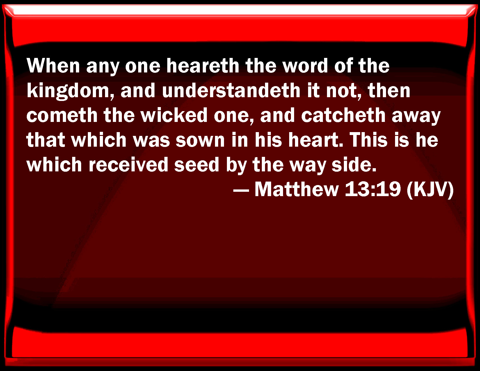Bible Verse Slide Matthew 13:19 When any one hears the word of the kingdom, and understands it not, then comes the wicked one, and catches away that which was sown in his heart. This is he which received seed by the way side. KJV: When any one heareth the word of the kingdom, and understandeth it not, then cometh the wicked one, and catcheth away that which was sown in his heart. This is he which received seed by the way side. DRB: When any one heareth the word of the kingdom, and understandeth it not, there cometh the wicked one, and catcheth away that which was sown in his heart: this is he that received the seed by the way side. DBT: From every one who hears the word of the kingdom and does not understand it, the wicked one comes and catches away what was sown in his heart: this is he that is sown by the wayside. ERV: When any one heareth the word of the kingdom, and understandeth it not, then cometh the evil one, and snatcheth away that which hath been sown in his heart. This is he that was sown by the way side. WBT: When any one heareth the word of the kingdom, and understandeth it not, then cometh the wicked one, and catcheth away that which was sown in his heart. This is he who received seed by the way side. WEB: When anyone hears the word of the Kingdom, and doesn't understand it, the evil one comes, and snatches away that which has been sown in his heart. This is what was sown by the roadside. YLT: Every one hearing the word of the reign, and not understanding — the evil one doth come, and doth catch that which hath been sown in his heart; this is that sown by the way.Links Matthew 13:19 NIV • Matthew 13:19 NLT • Matthew 13:19 ESV • Matthew 13:19 NASB • Matthew 13:19 KJV • Matthew 13:19 Interlinear • Matthew 13:19 Commentaries • Matthew 13:19 Parallel Texts • Matthew 13:19 Bible Apps • Matthew 13:19 Parallel • Bible Hub |