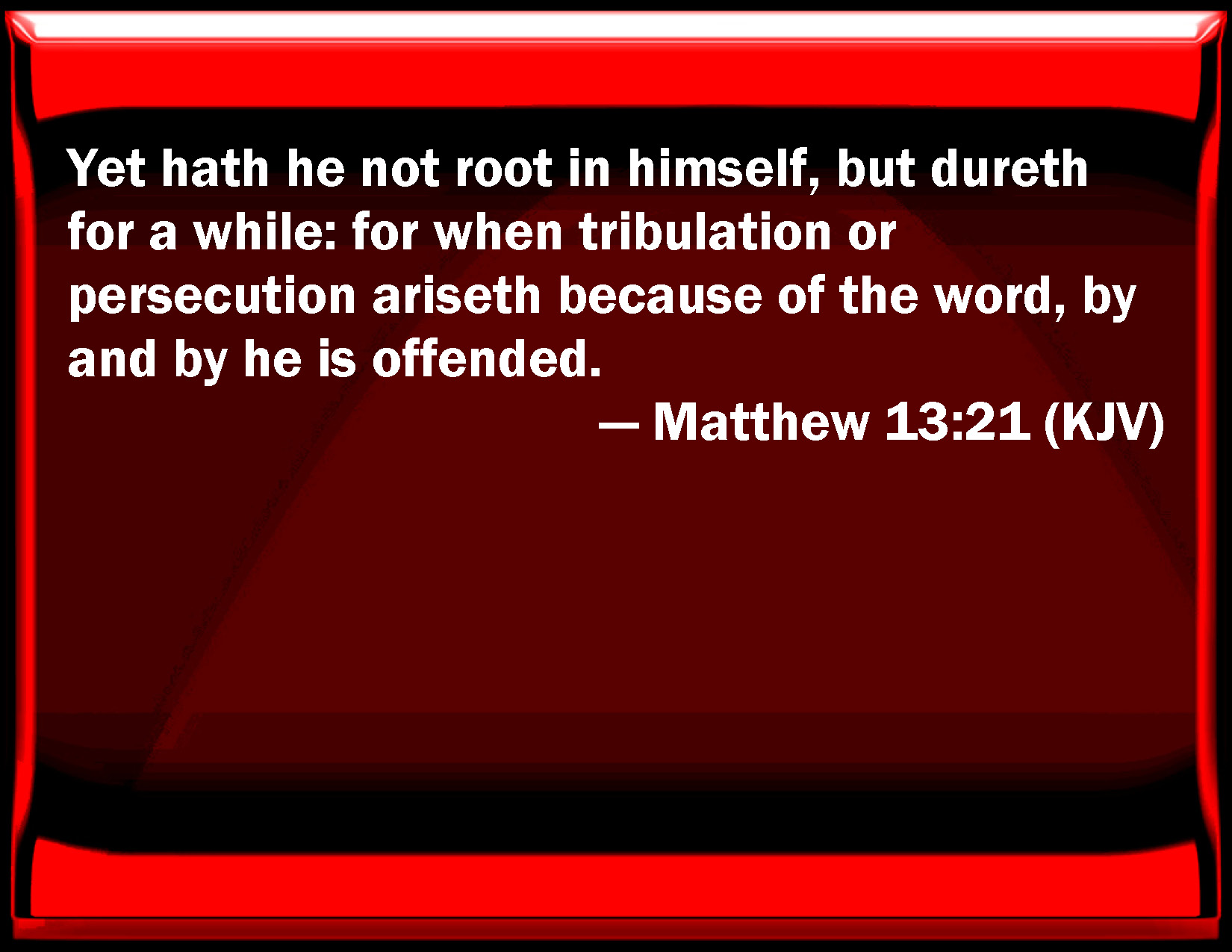 Bible Verse Slide Matthew 13:21 Yet has he not root in himself, but endures for a while: for when tribulation or persecution rises because of the word, by and by he is offended. KJV: Yet hath he not root in himself, but dureth for a while: for when tribulation or persecution ariseth because of the word, by and by he is offended. DRB: Yet hath he not root in himself, but is only for a time: and when there ariseth tribulation and persecution because of the word, he is presently scandalized. DBT: but has no root in himself, but is for a time only; and when tribulation or persecution happens on account of the word, he is immediately offended. ERV: yet hath he not root in himself, but endureth for a while; and when tribulation or persecution ariseth because of the word, straightway he stumbleth. WBT: Yet he hath not root in himself, but endureth for a while: for when tribulation or persecution ariseth because of the word, forthwith he is offended. WEB: yet he has no root in himself, but endures for a while. When oppression or persecution arises because of the word, immediately he stumbles. YLT: and he hath not root in himself, but is temporary, and persecution or tribulation having happened because of the word, immediately he is stumbled.Links Matthew 13:21 NIV • Matthew 13:21 NLT • Matthew 13:21 ESV • Matthew 13:21 NASB • Matthew 13:21 KJV • Matthew 13:21 Interlinear • Matthew 13:21 Commentaries • Matthew 13:21 Parallel Texts • Matthew 13:21 Bible Apps • Matthew 13:21 Parallel • Bible Hub |