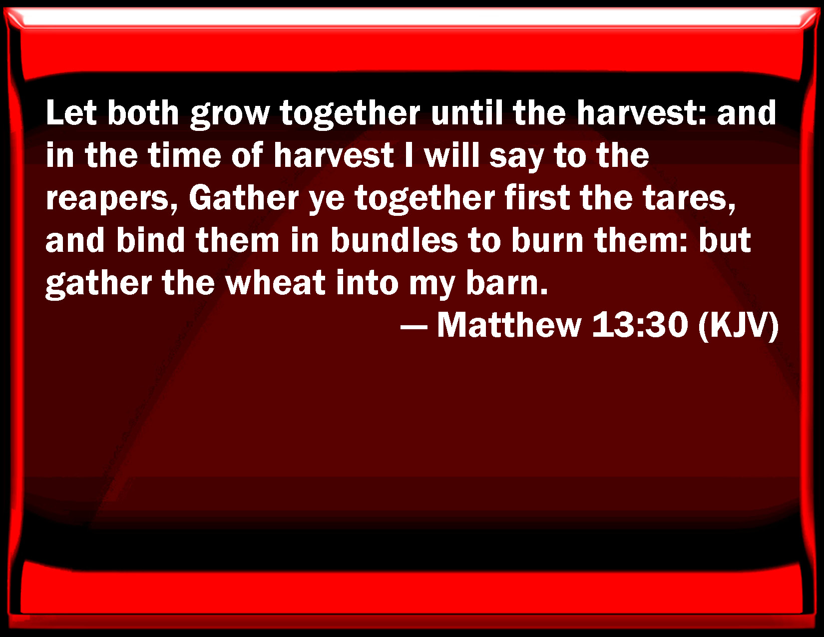 Bible Verse Slide Matthew 13:30 Let both grow together until the harvest: and in the time of harvest I will say to the reapers, Gather you together first the tares, and bind them in bundles to burn them: but gather the wheat into my barn. KJV: Let both grow together until the harvest: and in the time of harvest I will say to the reapers, Gather ye together first the tares, and bind them in bundles to burn them: but gather the wheat into my barn. DRB: Suffer both to grow until the harvest, and in the time of the harvest I will say to the reapers: Gather up first the cockle, and bind it into bundles to burn, but the wheat gather ye into my barn. DBT: Suffer both to grow together unto the harvest, and in time of the harvest I will say to the harvestmen, Gather first the darnel, and bind it into bundles to burn it; but the wheat bring together into my granary. ERV: Let both grow together until the harvest: and in the time of the harvest I will say to the reapers, Gather up first the tares, and bind them in bundles to burn them: but gather the wheat into my barn. WBT: Let both grow together until the harvest: and in the time of harvest I will say to the reapers, Gather ye first the tares, and bind them in bundles to burn them: but gather the wheat into my barn. WEB: Let both grow together until the harvest, and in the harvest time I will tell the reapers, "First, gather up the darnel weeds, and bind them in bundles to burn them; but gather the wheat into my barn."'" YLT: suffer both to grow together till the harvest, and in the time of the harvest I will say to the reapers, Gather up first the darnel, and bind it in bundles, to burn it, and the wheat gather up into my storehouse.'Links Matthew 13:30 NIV • Matthew 13:30 NLT • Matthew 13:30 ESV • Matthew 13:30 NASB • Matthew 13:30 KJV • Matthew 13:30 Interlinear • Matthew 13:30 Commentaries • Matthew 13:30 Parallel Texts • Matthew 13:30 Bible Apps • Matthew 13:30 Parallel • Bible Hub |