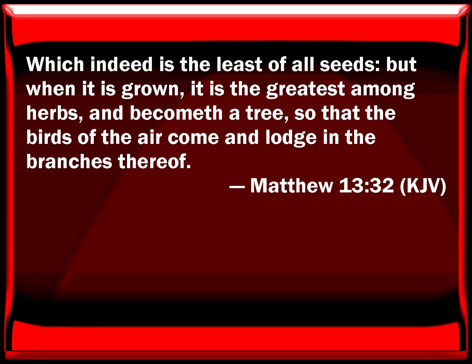 Bible Verse Slide Matthew 13:32 Which indeed is the least of all seeds: but when it is grown, it is the greatest among herbs, and becomes a tree, so that the birds of the air come and lodge in the branches thereof. KJV: Which indeed is the least of all seeds: but when it is grown, it is the greatest among herbs, and becometh a tree, so that the birds of the air come and lodge in the branches thereof. DRB: Which is the least indeed of all seeds; but when it is grown up, it is greater than all herbs, and becometh a tree, so that the birds of the air come, and dwell in the branches thereof. DBT: which is less indeed than all seeds, but when it is grown is greater than herbs, and becomes a tree, so that the birds of heaven come and roost in its branches. ERV: which indeed is less than all seeds; but when it is grown, it is greater than the herbs, and becometh a tree, so that the birds of the heaven come and lodge in the branches thereof. WBT: Which indeed is the least of all seeds: but when it is grown, it is the greatest among herbs, and becometh a tree, so that the birds of the air come and lodge on its branches. WEB: which indeed is smaller than all seeds. But when it is grown, it is greater than the herbs, and becomes a tree, so that the birds of the air come and lodge in its branches." YLT: which less, indeed, is than all the seeds, but when it may be grown, is greatest of the herbs, and becometh a tree, so that the birds of the heaven do come and rest in its branches.'Links Matthew 13:32 NIV • Matthew 13:32 NLT • Matthew 13:32 ESV • Matthew 13:32 NASB • Matthew 13:32 KJV • Matthew 13:32 Interlinear • Matthew 13:32 Commentaries • Matthew 13:32 Parallel Texts • Matthew 13:32 Bible Apps • Matthew 13:32 Parallel • Bible Hub |
