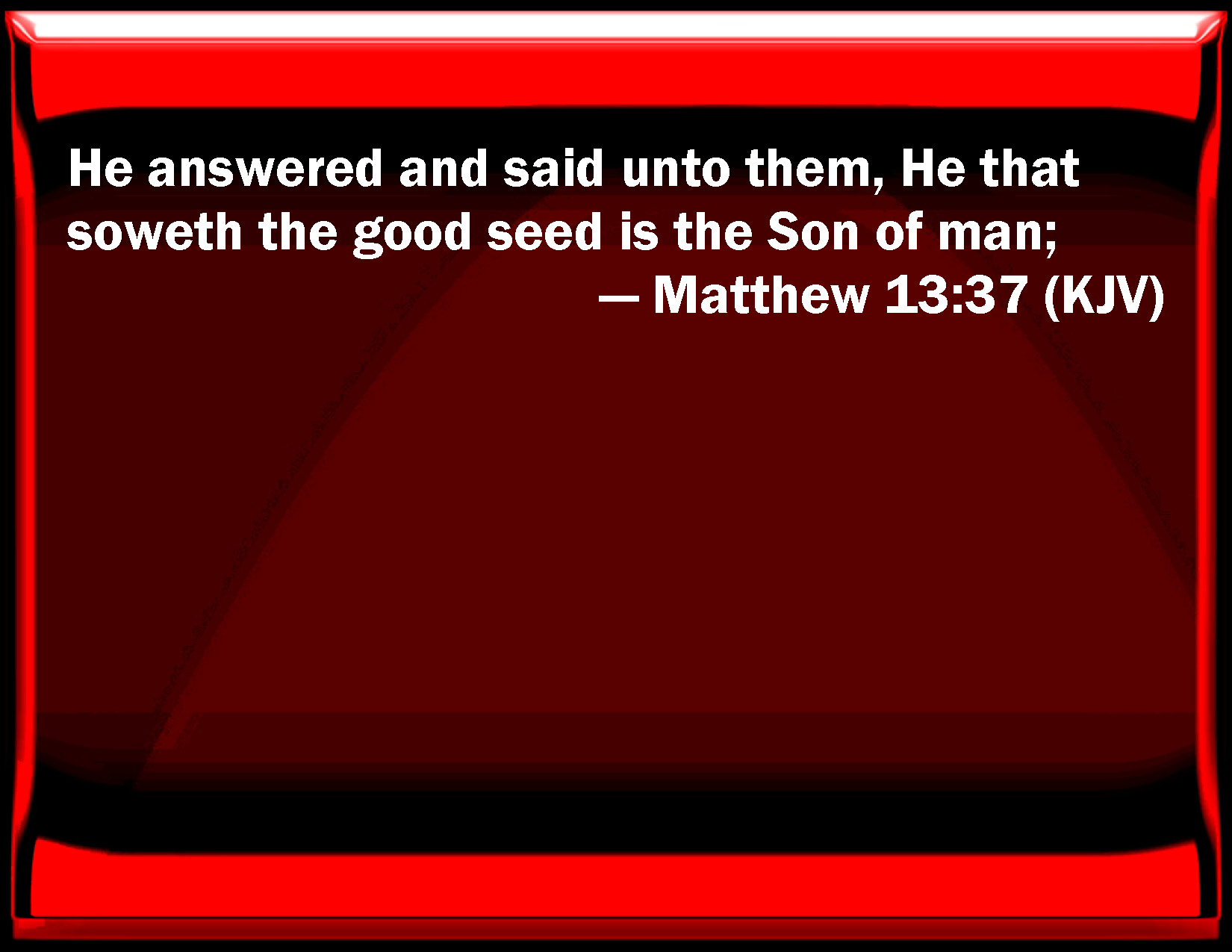 Bible Verse Slide Matthew 13:37 He answered and said to them, He that sows the good seed is the Son of man; KJV: He answered and said unto them, He that soweth the good seed is the Son of man; DRB: Who made answer and said to them: He that soweth the good seed, is the Son of man. DBT: But he answering said, He that sows the good seed is the Son of man, ERV: And he answered and said, He that soweth the good seed is the Son of man; WBT: He answered and said to them, He that soweth the good seed is the Son of man; WEB: He answered them, "He who sows the good seed is the Son of Man, YLT: And he answering said to them, 'He who is sowing the good seed is the Son of Man,Links Matthew 13:37 NIV • Matthew 13:37 NLT • Matthew 13:37 ESV • Matthew 13:37 NASB • Matthew 13:37 KJV • Matthew 13:37 Interlinear • Matthew 13:37 Commentaries • Matthew 13:37 Parallel Texts • Matthew 13:37 Bible Apps • Matthew 13:37 Parallel • Bible Hub |