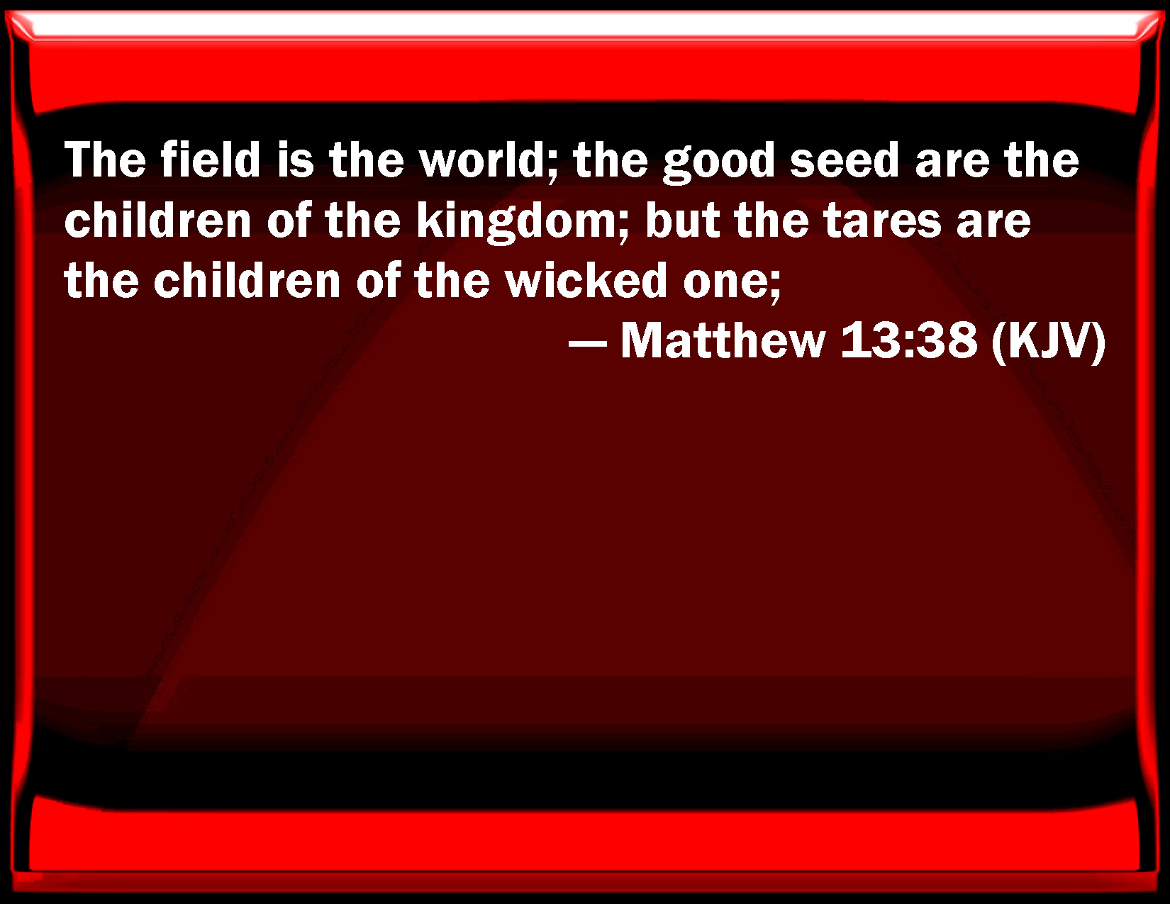 Bible Verse Slide Matthew 13:38 The field is the world; the good seed are the children of the kingdom; but the tares are the children of the wicked one; KJV: The field is the world; the good seed are the children of the kingdom; but the tares are the children of the wicked one; DRB: And the field, is the world. And the good seed are the children of the kingdom. And the cockle, are the children of the wicked one. DBT: and the field is the world; and the good seed, these are the sons of the kingdom, but the darnel are the sons of the evil one; ERV: and the field is the world; and the good seed, these are the sons of the kingdom; and the tares are the sons of the evil one; WBT: The field is the world; the good seed are the children of the kingdom; but the tares are the children of the wicked one; WEB: the field is the world; and the good seed, these are the children of the Kingdom; and the darnel weeds are the children of the evil one. YLT: and the field is the world, and the good seed, these are the sons of the reign, and the darnel are the sons of the evil one,Links Matthew 13:38 NIV • Matthew 13:38 NLT • Matthew 13:38 ESV • Matthew 13:38 NASB • Matthew 13:38 KJV • Matthew 13:38 Interlinear • Matthew 13:38 Commentaries • Matthew 13:38 Parallel Texts • Matthew 13:38 Bible Apps • Matthew 13:38 Parallel • Bible Hub |