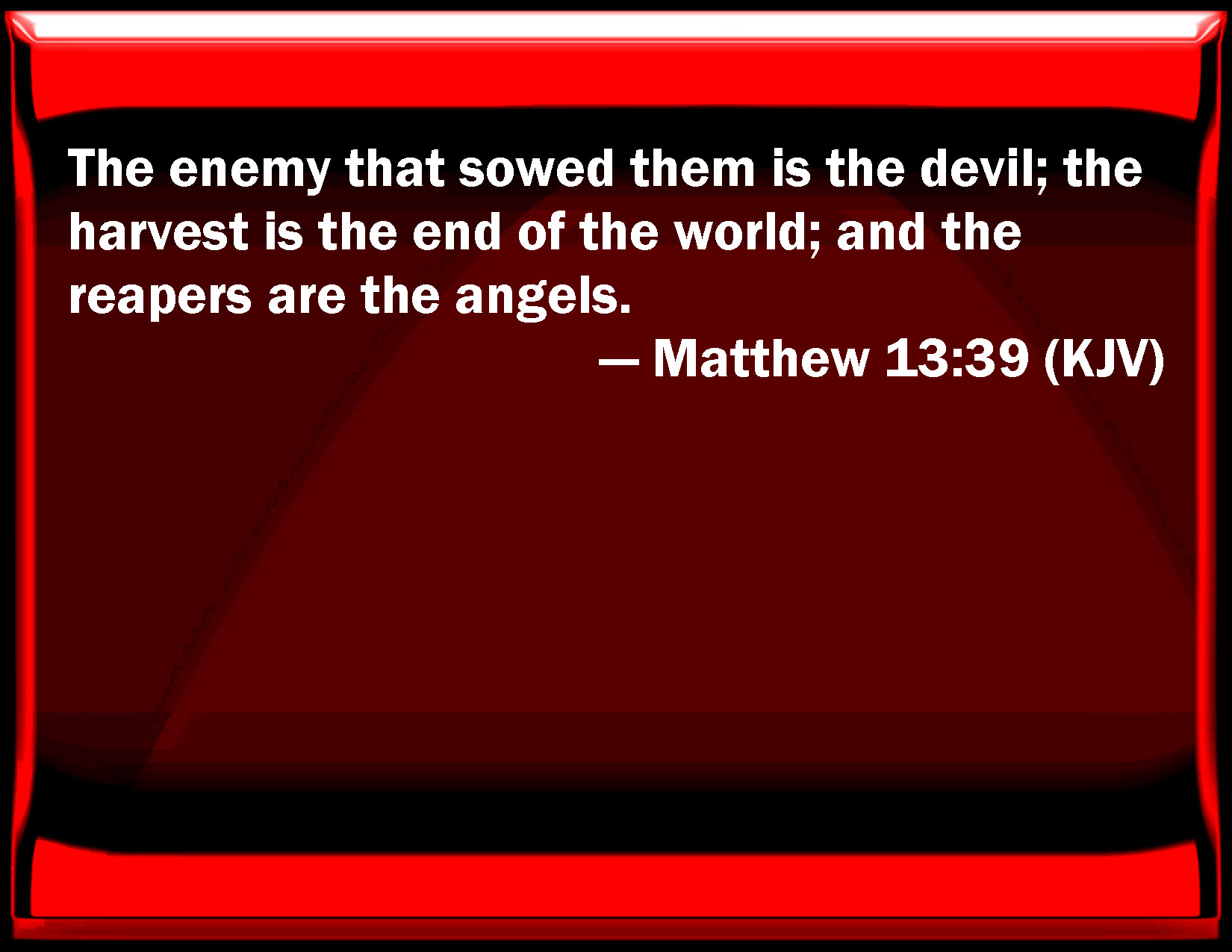 And the enemy that sowed them, is the devil. But the harvest is the end of the world. And the reapers are the angels.