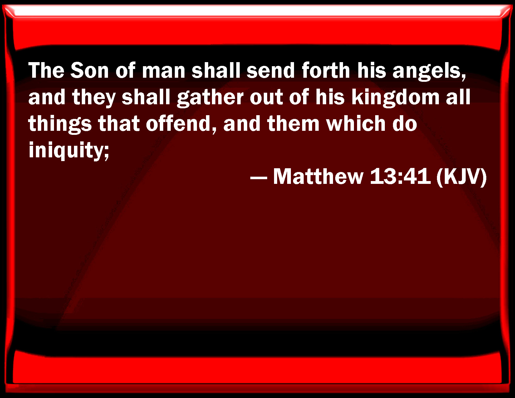Bible Verse Slide Matthew 13:41 The Son of man shall send forth his angels, and they shall gather out of his kingdom all things that offend, and them which do iniquity; KJV: The Son of man shall send forth his angels, and they shall gather out of his kingdom all things that offend, and them which do iniquity; DRB: The Son of man shall send his angels, and they shall gather out of his kingdom all scandals, and them that work iniquity. DBT: The Son of man shall send his angels, and they shall gather out of his kingdom all offences, and those that practise lawlessness; ERV: The Son of man shall send forth his angels, and they shall gather out of his kingdom all things that cause stumbling, and them that do iniquity, WBT: The Son of man shall send forth his angels, and they shall gather out of his kingdom all things that offend, and them who do iniquity; WEB: The Son of Man will send out his angels, and they will gather out of his Kingdom all things that cause stumbling, and those who do iniquity, YLT: the Son of Man shall send forth his messengers, and they shall gather up out of his kingdom all the stumbling-blocks, and those doing the unlawlessness,Links Matthew 13:41 NIV • Matthew 13:41 NLT • Matthew 13:41 ESV • Matthew 13:41 NASB • Matthew 13:41 KJV • Matthew 13:41 Interlinear • Matthew 13:41 Commentaries • Matthew 13:41 Parallel Texts • Matthew 13:41 Bible Apps • Matthew 13:41 Parallel • Bible Hub |