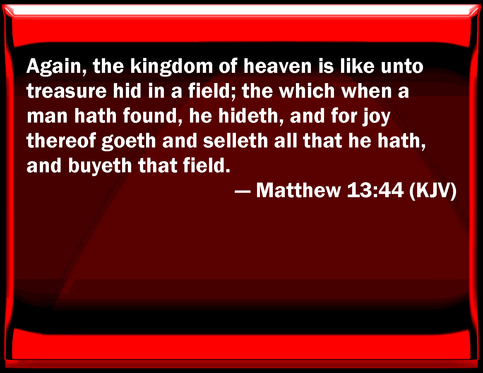 Bible Verse Slide Matthew 13:44 Again, the kingdom of heaven is like to treasure hid in a field; the which when a man has found, he hides, and for joy thereof goes and sells all that he has, and buys that field. KJV: Again, the kingdom of heaven is like unto treasure hid in a field; the which when a man hath found, he hideth, and for joy thereof goeth and selleth all that he hath, and buyeth that field. DRB: The kingdom of heaven is like unto a treasure hidden in a field. Which a man having found, hid it, and for joy thereof goeth, and selleth all that he hath, and buyeth that field. DBT: The kingdom of the heavens is like a treasure hid in the field, which a man having found has hid, and for the joy of it goes and sells all whatever he has, and buys that field. ERV: The kingdom of heaven is like unto a treasure hidden in the field; which a man found, and hid; and in his joy he goeth and selleth all that he hath, and buyeth that field. WBT: Again, the kingdom of heaven is like treasure hid in a field; which, when a man hath found, he hideth, and for joy thereof goeth and selleth all that he hath, and buyeth that field. WEB: "Again, the Kingdom of Heaven is like a treasure hidden in the field, which a man found, and hid. In his joy, he goes and sells all that he has, and buys that field. YLT: 'Again, the reign of the heavens is like to treasure hid in the field, which a man having found did hide, and from his joy goeth, and all, as much as he hath, he selleth, and buyeth that field.Links Matthew 13:44 NIV • Matthew 13:44 NLT • Matthew 13:44 ESV • Matthew 13:44 NASB • Matthew 13:44 KJV • Matthew 13:44 Interlinear • Matthew 13:44 Commentaries • Matthew 13:44 Parallel Texts • Matthew 13:44 Bible Apps • Matthew 13:44 Parallel • Bible Hub |