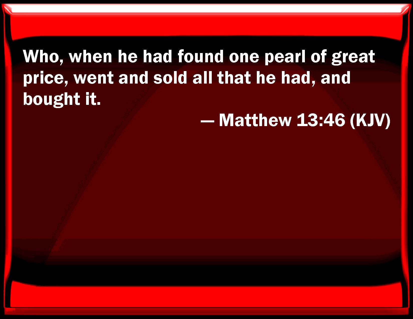 Bible Verse Slide Matthew 13:46 Who, when he had found one pearl of great price, went and sold all that he had, and bought it. KJV: Who, when he had found one pearl of great price, went and sold all that he had, and bought it. DRB: Who when he had found one pearl of great price, went his way, and sold all that he had, and bought it. DBT: and having found one pearl of great value, he went and sold all whatever he had and bought it. ERV: and having found one pearl of great price, he went and sold all that he had, and bought it. WBT: Who, when he had found one pearl of great price, went and sold all that he had, and bought it. WEB: who having found one pearl of great price, he went and sold all that he had, and bought it. YLT: who having found one pearl of great price, having gone away, hath sold all, as much as he had, and bought it.Links Matthew 13:46 NIV • Matthew 13:46 NLT • Matthew 13:46 ESV • Matthew 13:46 NASB • Matthew 13:46 KJV • Matthew 13:46 Interlinear • Matthew 13:46 Commentaries • Matthew 13:46 Parallel Texts • Matthew 13:46 Bible Apps • Matthew 13:46 Parallel • Bible Hub |