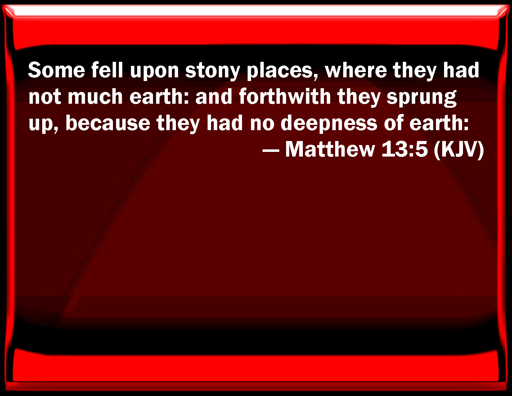 Bible Verse Slide Matthew 13:5 Some fell on stony places, where they had not much earth: and immediately they sprung up, because they had no deepness of earth: KJV: Some fell upon stony places, where they had not much earth: and forthwith they sprung up, because they had no deepness of earth: DRB: And other some fell upon stony ground, where they had not much earth: and they sprung up immediately, because they had no deepness of earth. DBT: and others fell upon the rocky places where they had not much earth, and immediately they sprang up out of the ground because of not having any depth of earth, ERV: and others fell upon the rocky places, where they had not much earth: and straightway they sprang up, because they had no deepness of earth: WBT: Some fell upon stony places, where they had not much earth: and forthwith they sprung up, because they had no deepness of earth: WEB: Others fell on rocky ground, where they didn't have much soil, and immediately they sprang up, because they had no depth of earth. YLT: and others fell upon the rocky places, where they had not much earth, and immediately they sprang forth, through not having depth of earth,Links Matthew 13:5 NIV • Matthew 13:5 NLT • Matthew 13:5 ESV • Matthew 13:5 NASB • Matthew 13:5 KJV • Matthew 13:5 Interlinear • Matthew 13:5 Commentaries • Matthew 13:5 Parallel Texts • Matthew 13:5 Bible Apps • Matthew 13:5 Parallel • Bible Hub |