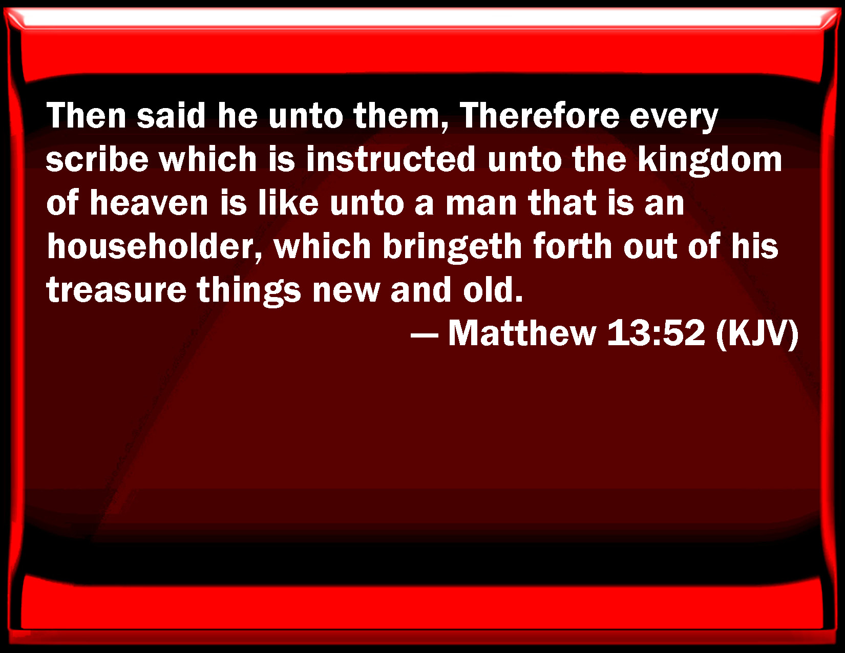 Bible Verse Slide Matthew 13:52 Then said he to them, Therefore every scribe which is instructed to the kingdom of heaven is like to a man that is an householder, which brings forth out of his treasure things new and old. KJV: Then said he unto them, Therefore every scribe which is instructed unto the kingdom of heaven is like unto a man that is an householder, which bringeth forth out of his treasure things new and old. DRB: He said unto them: Therefore every scribe instructed in the kingdom of heaven, is like to a man that is a householder, who bringeth forth out of his treasure new things and old. DBT: And he said to them, For this reason every scribe discipled to the kingdom of the heavens is like a man that is a householder who brings out of his treasure things new and old. ERV: And he said unto them, Therefore every scribe who hath been made a disciple to the kingdom of heaven is like unto a man that is a householder, which bringeth forth out of his treasure things new and old. WBT: Then said he to them, Therefore every scribe who is instructed to the kingdom of heaven, is like a man that is a householder, who bringeth forth out of his treasure things new and old. WEB: He said to them, "Therefore, every scribe who has been made a disciple in the Kingdom of Heaven is like a man who is a householder, who brings out of his treasure new and old things." YLT: And he said to them, 'Because of this every scribe having been discipled in regard to the reign of the heavens, is like to a man, a householder, who doth bring forth out of his treasure things new and old.'Links Matthew 13:52 NIV • Matthew 13:52 NLT • Matthew 13:52 ESV • Matthew 13:52 NASB • Matthew 13:52 KJV • Matthew 13:52 Interlinear • Matthew 13:52 Commentaries • Matthew 13:52 Parallel Texts • Matthew 13:52 Bible Apps • Matthew 13:52 Parallel • Bible Hub |