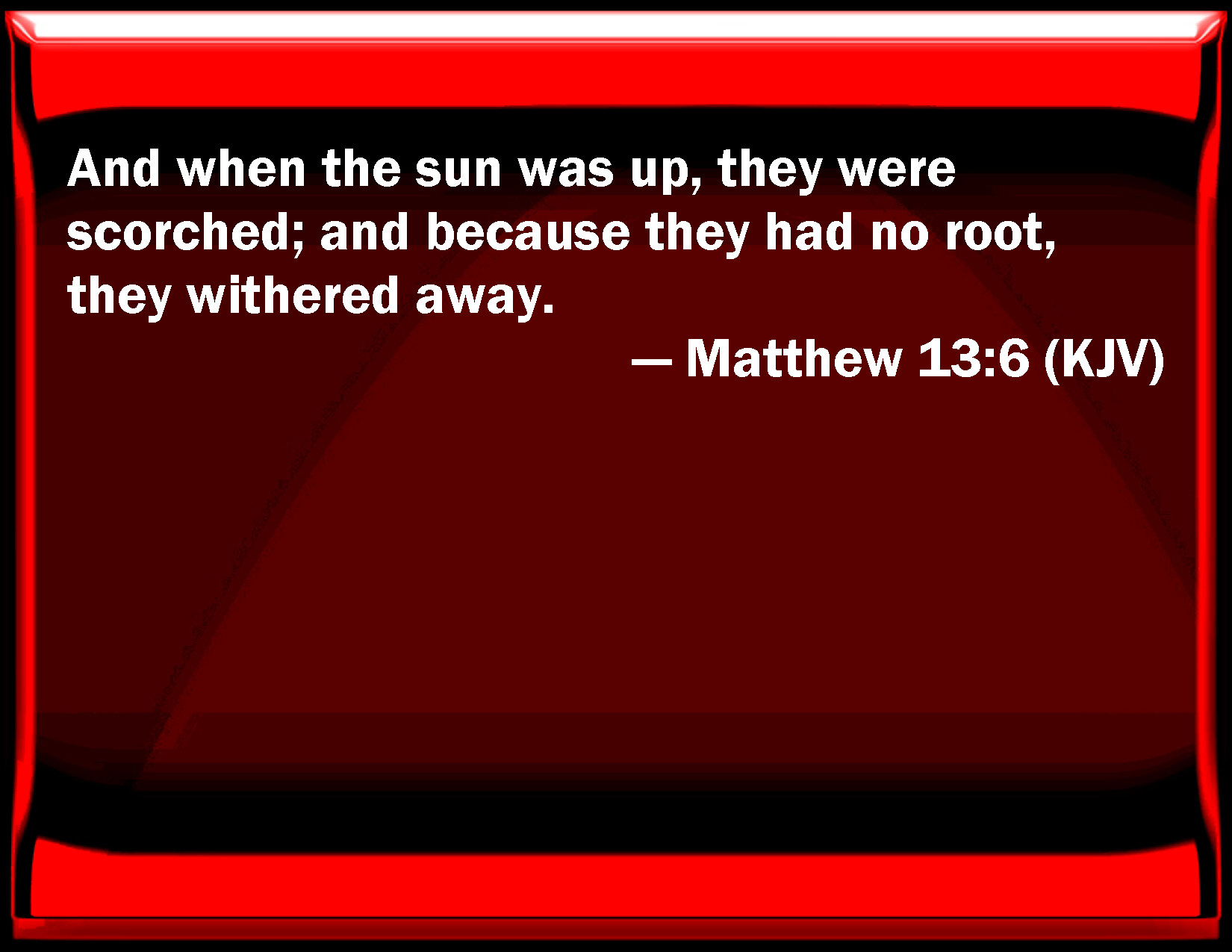 Bible Verse Slide Matthew 13:6 And when the sun was up, they were scorched; and because they had no root, they withered away. KJV: And when the sun was up, they were scorched; and because they had no root, they withered away. DRB: And when the sun was up they were scorched: and because they had not root, they withered away. DBT: but when the sun rose they were burned up, and because of not having any root were dried up; ERV: and when the sun was risen, they were scorched; and because they had no root, they withered away. WBT: And when the sun had risen, they were scorched; and because they had not root, they withered. WEB: When the sun had risen, they were scorched. Because they had no root, they withered away. YLT: and the sun having risen they were scorched, and through not having root, they withered,Links Matthew 13:6 NIV • Matthew 13:6 NLT • Matthew 13:6 ESV • Matthew 13:6 NASB • Matthew 13:6 KJV • Matthew 13:6 Interlinear • Matthew 13:6 Commentaries • Matthew 13:6 Parallel Texts • Matthew 13:6 Bible Apps • Matthew 13:6 Parallel • Bible Hub |