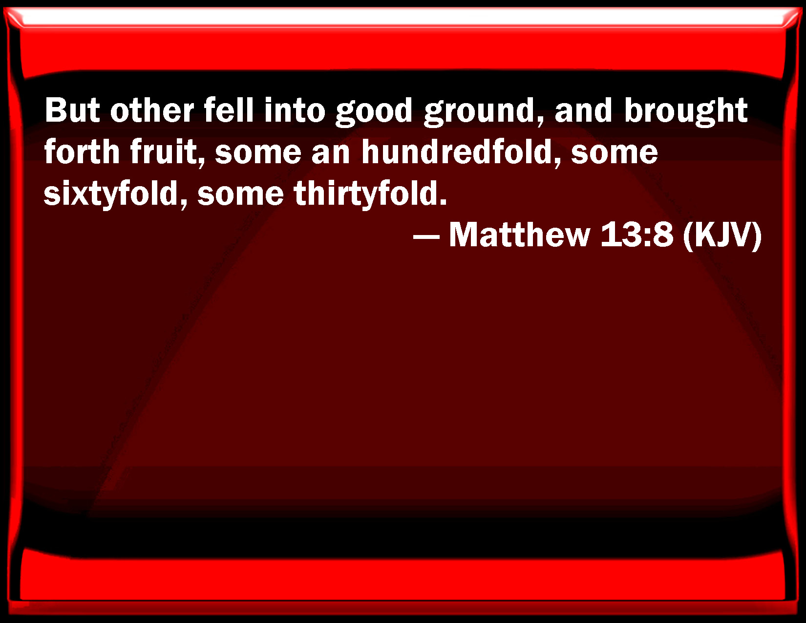 Bible Verse Slide Matthew 13:8 But other fell into good ground, and brought forth fruit, some an hundred times, some sixty times, some thirty times. KJV: But other fell into good ground, and brought forth fruit, some an hundredfold, some sixtyfold, some thirtyfold. DRB: And others fell upon good ground: and they brought forth fruit, some an hundredfold, some sixtyfold, and some thirtyfold. DBT: and others fell upon the good ground, and produced fruit, one a hundred, one sixty, and one thirty. ERV: and others fell upon the good ground, and yielded fruit, some a hundredfold, some sixty, some thirty. WBT: But others fell into good ground, and brought forth fruit, some a hundred-fold, some sixty-fold, some thirty-fold. WEB: Others fell on good soil, and yielded fruit: some one hundred times as much, some sixty, and some thirty. YLT: and others fell upon the good ground, and were giving fruit, some indeed a hundredfold, and some sixty, and some thirty.Links Matthew 13:8 NIV • Matthew 13:8 NLT • Matthew 13:8 ESV • Matthew 13:8 NASB • Matthew 13:8 KJV • Matthew 13:8 Interlinear • Matthew 13:8 Commentaries • Matthew 13:8 Parallel Texts • Matthew 13:8 Bible Apps • Matthew 13:8 Parallel • Bible Hub |