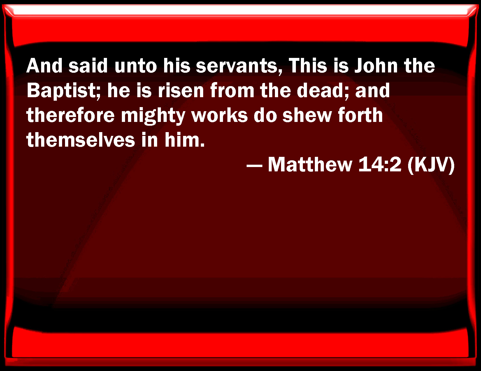 Bible Verse Slide Matthew 14:2 And said to his servants, This is John the Baptist; he is risen from the dead; and therefore mighty works do show forth themselves in him. KJV: And said unto his servants, This is John the Baptist; he is risen from the dead; and therefore mighty works do shew forth themselves in him. DRB: And he said to his servants: This is John the Baptist: he is risen from the dead, and therefore mighty works shew forth themselves in him. DBT: and said to his servants, This is John the baptist: he is risen from the dead, and because of this these works of power display their force in him. ERV: and said unto his servants, This is John the Baptist; he is risen from the dead; and therefore do these powers work in him. WBT: And said to his servants, This is John the Baptist; he hath risen from the dead; and therefore mighty works do show forth themselves in him. WEB: and said to his servants, "This is John the Baptizer. He is risen from the dead. That is why these powers work in him." YLT: and said to his servants, 'This is John the Baptist, he did rise from the dead, and because of this the mighty energies are working in him.'Links Matthew 14:2 NIV • Matthew 14:2 NLT • Matthew 14:2 ESV • Matthew 14:2 NASB • Matthew 14:2 KJV • Matthew 14:2 Interlinear • Matthew 14:2 Commentaries • Matthew 14:2 Parallel Texts • Matthew 14:2 Bible Apps • Matthew 14:2 Parallel • Bible Hub |