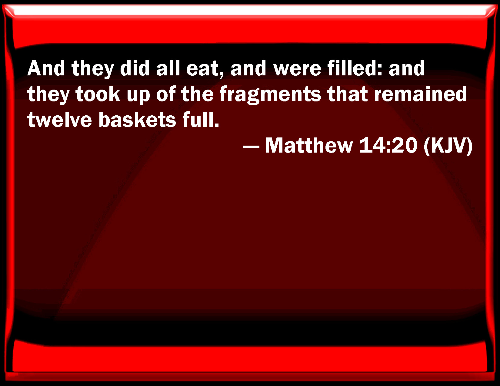 Bible Verse Slide Matthew 14:20 And they did all eat, and were filled: and they took up of the fragments that remained twelve baskets full. KJV: And they did all eat, and were filled: and they took up of the fragments that remained twelve baskets full. DRB: And they did all eat, and were filled. And they took up what remained, twelve full baskets of fragments. DBT: And all ate and were filled, and they took up what was over and above of fragments twelve hand-baskets full. ERV: And they did all eat, and were filled: and they took up that which remained over of the broken pieces, twelve baskets full. WBT: And they all ate, and were satisfied: and they took up of the fragments that remained twelve baskets full. WEB: They all ate, and were filled. They took up twelve baskets full of that which remained left over from the broken pieces. YLT: and they did all eat, and were filled, and they took up what was over of the broken pieces twelve hand-baskets full;Links Matthew 14:20 NIV • Matthew 14:20 NLT • Matthew 14:20 ESV • Matthew 14:20 NASB • Matthew 14:20 KJV • Matthew 14:20 Interlinear • Matthew 14:20 Commentaries • Matthew 14:20 Parallel Texts • Matthew 14:20 Bible Apps • Matthew 14:20 Parallel • Bible Hub |