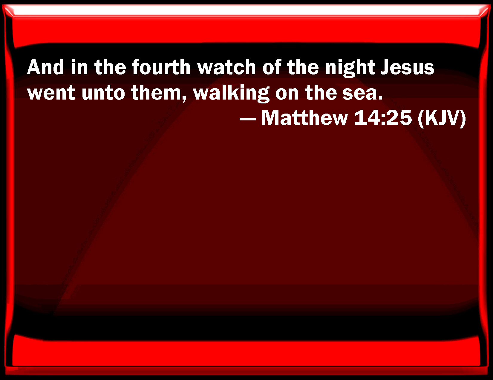 Bible Verse Slide Matthew 14:25 And in the fourth watch of the night Jesus went to them, walking on the sea. KJV: And in the fourth watch of the night Jesus went unto them, walking on the sea. DRB: And in the fourth watch of the night, he came to them walking upon the sea. DBT: But in the fourth watch of the night he went off to them, walking on the sea. ERV: And in the fourth watch of the night he came unto them, walking upon the sea. WBT: And in the fourth watch of the night Jesus went to them, walking on the sea. WEB: In the fourth watch of the night, Jesus came to them, walking on the sea. YLT: And in the fourth watch of the night Jesus went away to them, walking upon the sea,Links Matthew 14:25 NIV • Matthew 14:25 NLT • Matthew 14:25 ESV • Matthew 14:25 NASB • Matthew 14:25 KJV • Matthew 14:25 Interlinear • Matthew 14:25 Commentaries • Matthew 14:25 Parallel Texts • Matthew 14:25 Bible Apps • Matthew 14:25 Parallel • Bible Hub |