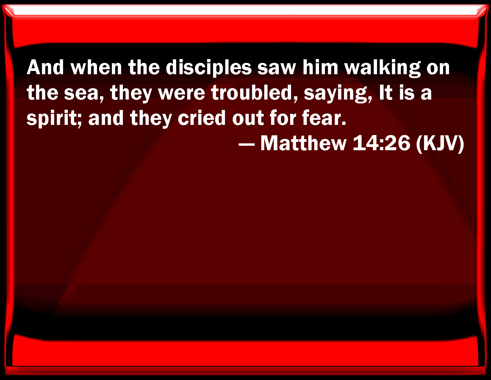 Bible Verse Slide Matthew 14:26 And when the disciples saw him walking on the sea, they were troubled, saying, It is a spirit; and they cried out for fear. KJV: And when the disciples saw him walking on the sea, they were troubled, saying, It is a spirit; and they cried out for fear. DRB: And they seeing him walk upon the sea, were troubled, saying: It is an apparition. And they cried out for fear. DBT: And the disciples, seeing him walking on the sea, were troubled, saying, It is an apparition. And they cried out through fear. ERV: And when the disciples saw him walking on the sea, they were troubled, saying, It is an apparition; and they cried out for fear. WBT: And when the disciples saw him walking on the sea, they were troubled, saying, It is a spirit; and they cried out for fear. WEB: When the disciples saw him walking on the sea, they were troubled, saying, "It's a ghost!" and they cried out for fear. YLT: and the disciples having seen him walking upon the sea, were troubled saying — 'It is an apparition,' and from the fear they cried out;Links Matthew 14:26 NIV • Matthew 14:26 NLT • Matthew 14:26 ESV • Matthew 14:26 NASB • Matthew 14:26 KJV • Matthew 14:26 Interlinear • Matthew 14:26 Commentaries • Matthew 14:26 Parallel Texts • Matthew 14:26 Bible Apps • Matthew 14:26 Parallel • Bible Hub |