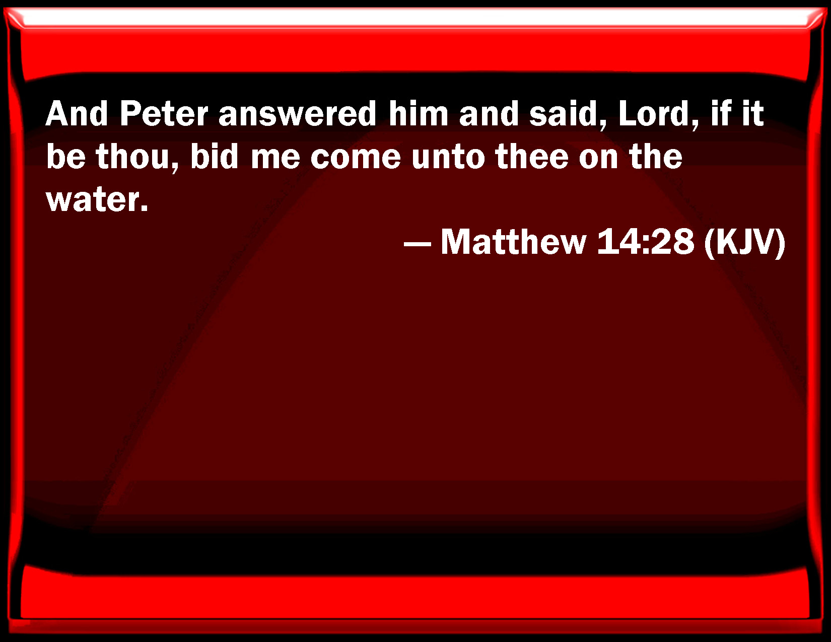 Bible Verse Slide Matthew 14:28 And Peter answered him and said, Lord, if it be you, bid me come to you on the water. KJV: And Peter answered him and said, Lord, if it be thou, bid me come unto thee on the water. DRB: And Peter making answer, said: Lord, if it be thou, bid me come to thee upon the waters. DBT: And Peter answering him said, Lord, if it be thou, command me to come to thee upon the waters. ERV: And Peter answered him and said, Lord, if it be thou, bid me come unto thee upon the waters. WBT: And Peter answered him and said, Lord, if it is thou, bid me come to thee on the water. WEB: Peter answered him and said, "Lord, if it is you, command me to come to you on the waters." YLT: And Peter answering him said, 'Sir, if it is thou, bid me come to thee upon the waters;'Links Matthew 14:28 NIV • Matthew 14:28 NLT • Matthew 14:28 ESV • Matthew 14:28 NASB • Matthew 14:28 KJV • Matthew 14:28 Interlinear • Matthew 14:28 Commentaries • Matthew 14:28 Parallel Texts • Matthew 14:28 Bible Apps • Matthew 14:28 Parallel • Bible Hub |