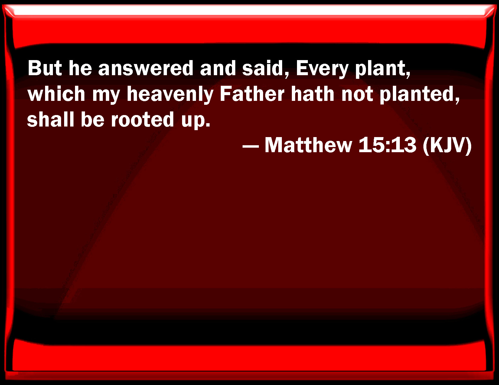 Bible Verse Slide Matthew 15:13 But he answered and said, Every plant, which my heavenly Father has not planted, shall be rooted up. KJV: But he answered and said, Every plant, which my heavenly Father hath not planted, shall be rooted up. DRB: But he answering them, said: Every plant which my heavenly Father hath not planted, shall be rooted up. DBT: But he answering said, Every plant which my heavenly Father has not planted shall be rooted up. ERV: But he answered and said, Every plant which my heavenly Father planted not, shall be rooted up. WBT: But he answered and said, Every plant, which my heavenly Father hath not planted, shall be extirpated. WEB: But he answered, "Every plant which my heavenly Father didn't plant will be uprooted. YLT: And he answering said, 'Every plant that my heavenly Father did not plant shall be rooted up;Links Matthew 15:13 NIV • Matthew 15:13 NLT • Matthew 15:13 ESV • Matthew 15:13 NASB • Matthew 15:13 KJV • Matthew 15:13 Interlinear • Matthew 15:13 Commentaries • Matthew 15:13 Parallel Texts • Matthew 15:13 Bible Apps • Matthew 15:13 Parallel • Bible Hub |