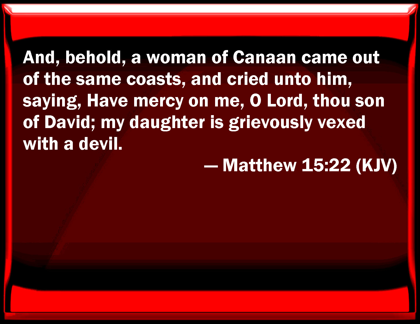 Bible Verse Slide Matthew 15:22 And, behold, a woman of Canaan came out of the same coasts, and cried to him, saying, Have mercy on me, O Lord, you son of David; my daughter is grievously vexed with a devil. KJV: And, behold, a woman of Canaan came out of the same coasts, and cried unto him, saying, Have mercy on me, O Lord, thou Son of David; my daughter is grievously vexed with a devil. DRB: And behold a woman of Canaan who came out of those coasts, crying out, said to him: Have mercy on me, O Lord, thou son of David: my daughter is grieviously troubled by the devil. DBT: and lo, a Canaanitish woman, coming out from those borders, cried to him saying, Have pity on me, Lord, Son of David; my daughter is miserably possessed by a demon. ERV: And behold, a Canaanitish woman came out from those borders, and cried, saying, Have mercy on me, O Lord, thou son of David; my daughter is grievously vexed with a devil. WBT: And behold, a woman of Canaan came out of the same territories, and cried to him, saying, Have mercy on me, O Lord, thou son of David; my daughter is grievously afflicted with a demon. WEB: Behold, a Canaanite woman came out from those borders, and cried, saying, "Have mercy on me, Lord, you son of David! My daughter is severely demonized!" YLT: and lo, a woman, a Canaanitess, from those borders having come forth, did call to him, saying, 'Deal kindly with me, Sir — Son of David; my daughter is miserably demonized.'Links Matthew 15:22 NIV • Matthew 15:22 NLT • Matthew 15:22 ESV • Matthew 15:22 NASB • Matthew 15:22 KJV • Matthew 15:22 Interlinear • Matthew 15:22 Commentaries • Matthew 15:22 Parallel Texts • Matthew 15:22 Bible Apps • Matthew 15:22 Parallel • Bible Hub |