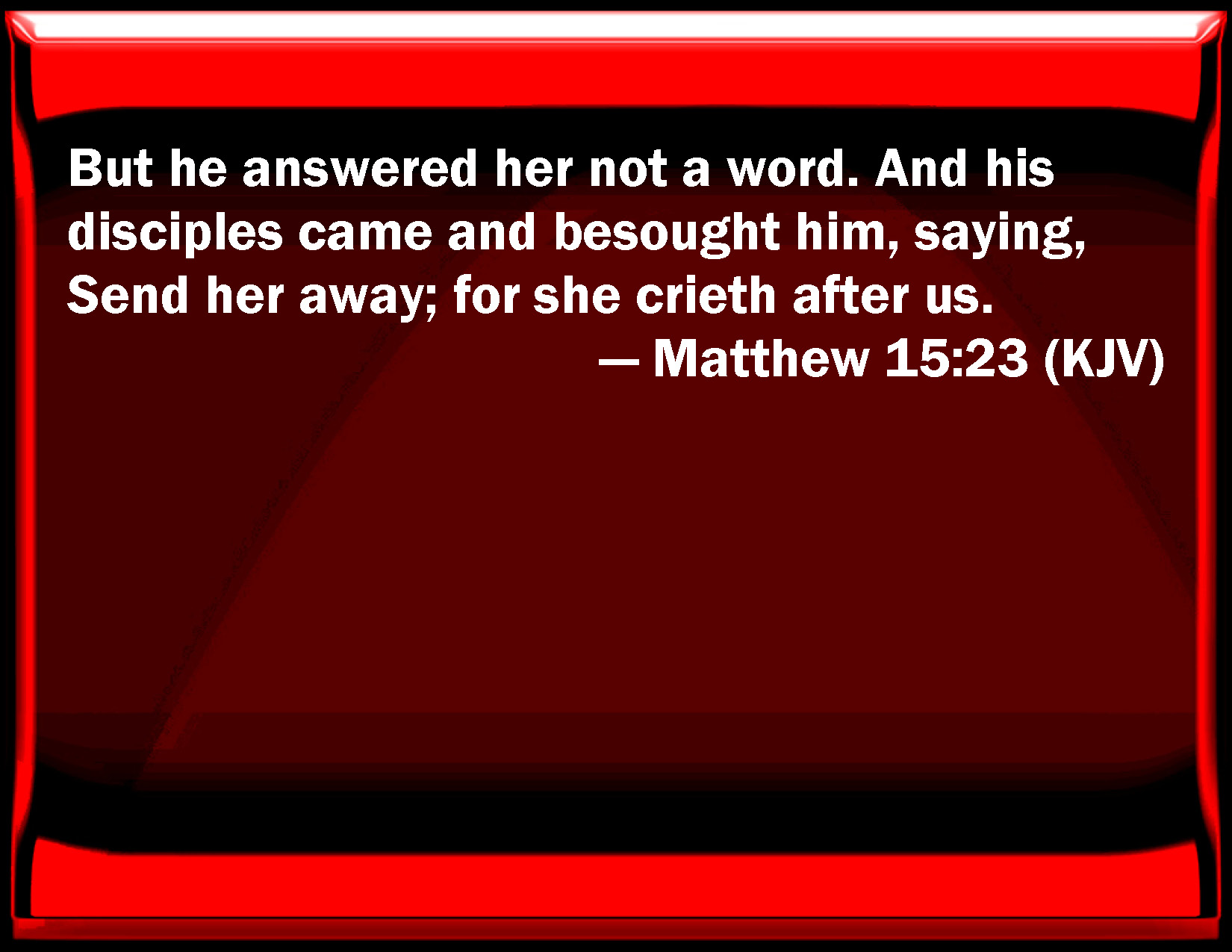Bible Verse Slide Matthew 15:23 But he answered her not a word. And his disciples came and sought him, saying, Send her away; for she cries after us. KJV: But he answered her not a word. And his disciples came and besought him, saying, Send her away; for she crieth after us. DRB: Who answered her not a word. And his disciples came and besought him, saying: Send her away, for she crieth after us: DBT: But he did not answer her a word. And his disciples came to him and asked him, saying, Dismiss her, for she cries after us. ERV: But he answered her not a word. And his disciples came and besought him, saying, Send her away; for she crieth after us. WBT: But he answered her not a word. And his disciples came and besought him, saying, Send her away; for she crieth after us. WEB: But he answered her not a word. His disciples came and begged him, saying, "Send her away; for she cries after us." YLT: And he did not answer her a word; and his disciples having come to him, were asking him, saying — 'Let her away, because she crieth after us;'Links Matthew 15:23 NIV • Matthew 15:23 NLT • Matthew 15:23 ESV • Matthew 15:23 NASB • Matthew 15:23 KJV • Matthew 15:23 Interlinear • Matthew 15:23 Commentaries • Matthew 15:23 Parallel Texts • Matthew 15:23 Bible Apps • Matthew 15:23 Parallel • Bible Hub |