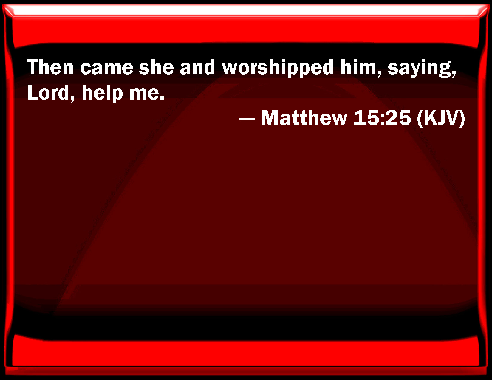 Bible Verse Slide Matthew 15:25 Then came she and worshipped him, saying, Lord, help me. KJV: Then came she and worshipped him, saying, Lord, help me. DRB: But she came and adored him, saying: Lord, help me. DBT: But she came and did him homage, saying, Lord, help me. ERV: But she came and worshipped him, saying, Lord, help me. WBT: Then came she and worshiped him, saying, Lord, help me. WEB: But she came and worshiped him, saying, "Lord, help me." YLT: And having come, she was bowing to him, saying, 'Sir, help me;'Links Matthew 15:25 NIV • Matthew 15:25 NLT • Matthew 15:25 ESV • Matthew 15:25 NASB • Matthew 15:25 KJV • Matthew 15:25 Interlinear • Matthew 15:25 Commentaries • Matthew 15:25 Parallel Texts • Matthew 15:25 Bible Apps • Matthew 15:25 Parallel • Bible Hub |