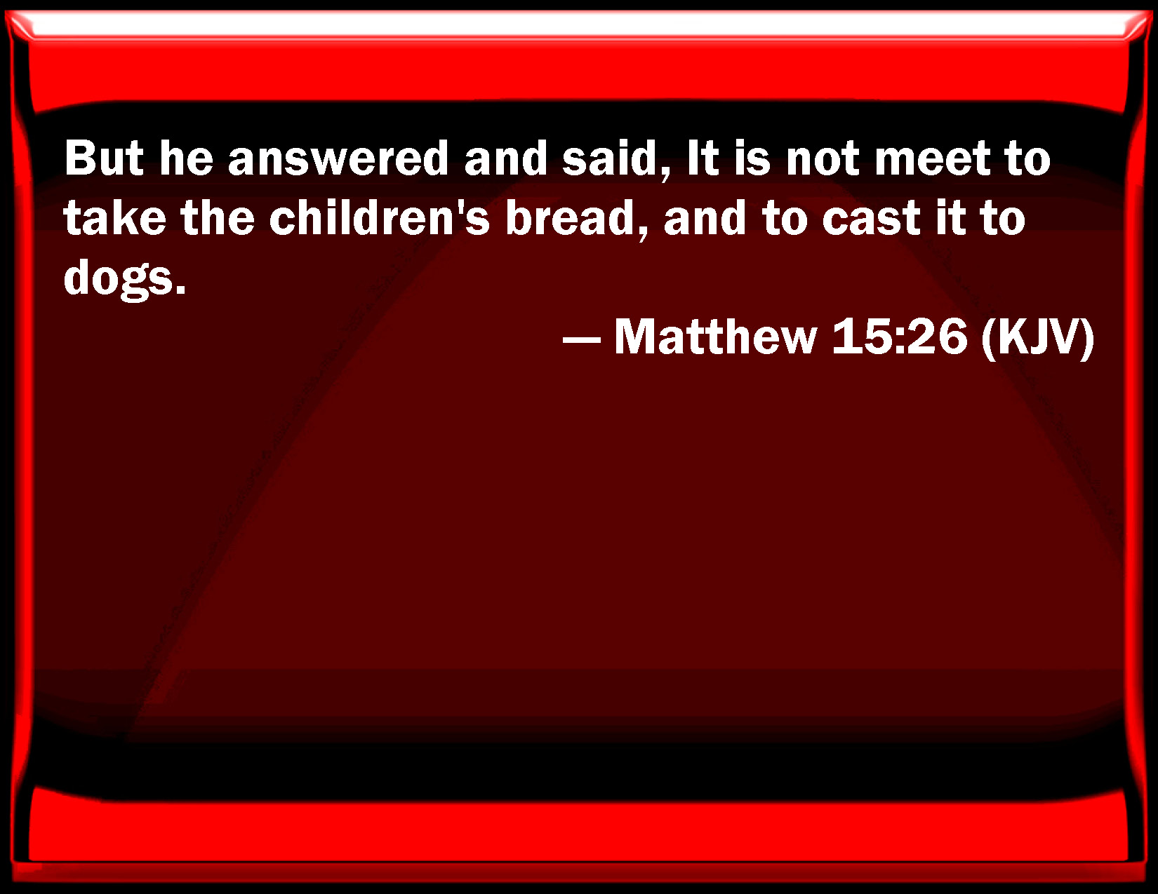 Bible Verse Slide Matthew 15:26 But he answered and said, It is not meet to take the children's bread, and to cast it to dogs. KJV: But he answered and said, It is not meet to take the children's bread, and to cast it to dogs. DRB: Who answering, said: It is not good to take the bread of the children, and to cast it to the dogs. DBT: But he answering said, It is not well to take the bread of the children and cast it to the dogs. ERV: And he answered and said, It is not meet to take the children's bread and cast it to the dogs. WBT: But he answered and said, It is not meet to take the children's bread, and to cast it to dogs. WEB: But he answered, "It is not appropriate to take the children's bread and throw it to the dogs." YLT: and he answering said, 'It is not good to take the children's bread, and to cast to the little dogs.'Links Matthew 15:26 NIV • Matthew 15:26 NLT • Matthew 15:26 ESV • Matthew 15:26 NASB • Matthew 15:26 KJV • Matthew 15:26 Interlinear • Matthew 15:26 Commentaries • Matthew 15:26 Parallel Texts • Matthew 15:26 Bible Apps • Matthew 15:26 Parallel • Bible Hub |