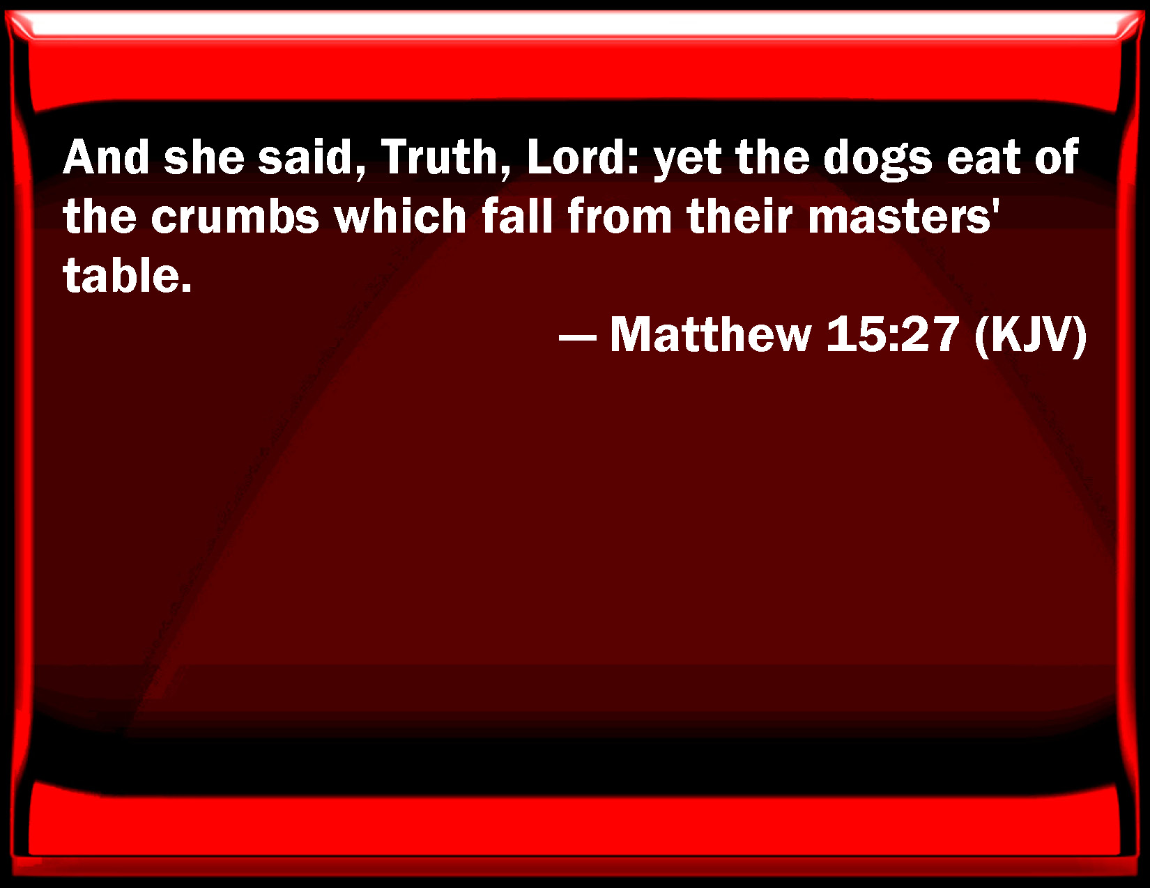 Bible Verse Slide Matthew 15:27 And she said, Truth, Lord: yet the dogs eat of the crumbs which fall from their masters' table. KJV: And she said, Truth, Lord: yet the dogs eat of the crumbs which fall from their masters' table. DRB: But she said: Yea, Lord; for the whelps also eat of the crumbs that fall from the table of their masters. DBT: But she said, Yea, Lord; for even the dogs eat of the crumbs which fall from the table of their masters. ERV: But she said, Yea, Lord: for even the dogs eat of the crumbs which fall from their masters' table. WBT: And she said, Truth, Lord: yet the dogs eat of the crums which fall from their master's table. WEB: But she said, "Yes, Lord, but even the dogs eat the crumbs which fall from their masters' table." YLT: And she said, 'Yes, sir, for even the little dogs do eat of the crumbs that are falling from their lords' table;'Links Matthew 15:27 NIV • Matthew 15:27 NLT • Matthew 15:27 ESV • Matthew 15:27 NASB • Matthew 15:27 KJV • Matthew 15:27 Interlinear • Matthew 15:27 Commentaries • Matthew 15:27 Parallel Texts • Matthew 15:27 Bible Apps • Matthew 15:27 Parallel • Bible Hub |
