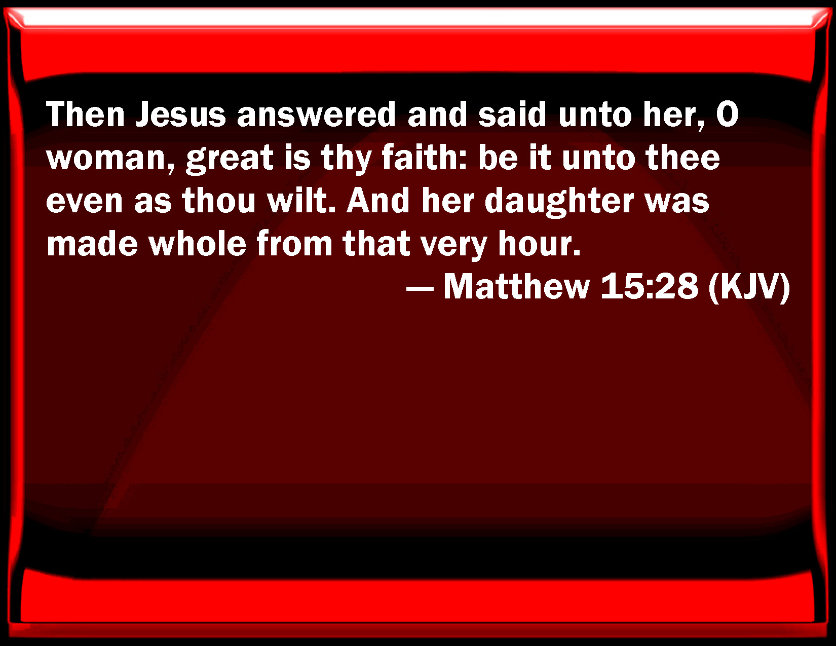 Bible Verse Slide Matthew 15:28 Then Jesus answered and said to her, O woman, great is your faith: be it to you even as you will. And her daughter was made whole from that very hour. KJV: Then Jesus answered and said unto her, O woman, great is thy faith: be it unto thee even as thou wilt. And her daughter was made whole from that very hour. DRB: Then Jesus answering, said to her: O woman, great is thy faith: be it done to thee as thou wilt: and her daughter was cured from that hour. DBT: Then Jesus answering said to her, O woman, thy faith is great. Be it to thee as thou desirest. And her daughter was healed from that hour. ERV: Then Jesus answered and said unto her, O woman, great is thy faith: be it done unto thee even as thou wilt. And her daughter was healed from that hour. WBT: Then Jesus answered and said to her, O woman, great is thy faith: be it to thee even as thou wilt. And her daughter was healed from that very hour. WEB: Then Jesus answered her, "Woman, great is your faith! Be it done to you even as you desire." And her daughter was healed from that hour. YLT: then answering, Jesus said to her, 'O woman, great is thy faith, let it be to thee as thou wilt;' and her daughter was healed from that hour.Links Matthew 15:28 NIV • Matthew 15:28 NLT • Matthew 15:28 ESV • Matthew 15:28 NASB • Matthew 15:28 KJV • Matthew 15:28 Interlinear • Matthew 15:28 Commentaries • Matthew 15:28 Parallel Texts • Matthew 15:28 Bible Apps • Matthew 15:28 Parallel • Bible Hub |
