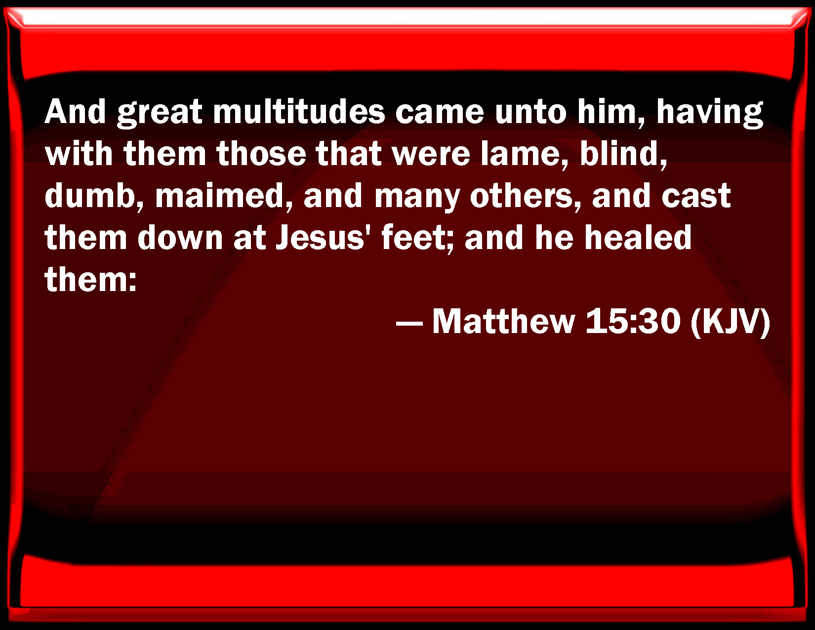 Bible Verse Slide Matthew 15:30 And great multitudes came to him, having with them those that were lame, blind, dumb, maimed, and many others, and cast them down at Jesus' feet; and he healed them: KJV: And great multitudes came unto him, having with them those that were lame, blind, dumb, maimed, and many others, and cast them down at Jesus' feet; and he healed them: DRB: And there came to him great multitudes, having with them the dumb, the blind, the lame, the maimed, and many others: and they cast them down at his feet, and he healed them: DBT: and great crowds came to him, having with them lame, blind, dumb, crippled, and many others, and they cast them at his feet, and he healed them: ERV: And there came unto him great multitudes, having with them the lame, blind, dumb, maimed, and many others, and they cast them down at his feet; and he healed them: WBT: And great multitudes came to him, having with them those that were lame, blind, dumb, maimed, and many others, and cast them down at Jesus' feet; and he healed them: WEB: Great multitudes came to him, having with them the lame, blind, mute, maimed, and many others, and they put them down at his feet. He healed them, YLT: and there came to him great multitudes, having with them lame, blind, dumb, maimed, and many others, and they did cast them at the feet of Jesus, and he healed them,Links Matthew 15:30 NIV • Matthew 15:30 NLT • Matthew 15:30 ESV • Matthew 15:30 NASB • Matthew 15:30 KJV • Matthew 15:30 Interlinear • Matthew 15:30 Commentaries • Matthew 15:30 Parallel Texts • Matthew 15:30 Bible Apps • Matthew 15:30 Parallel • Bible Hub |