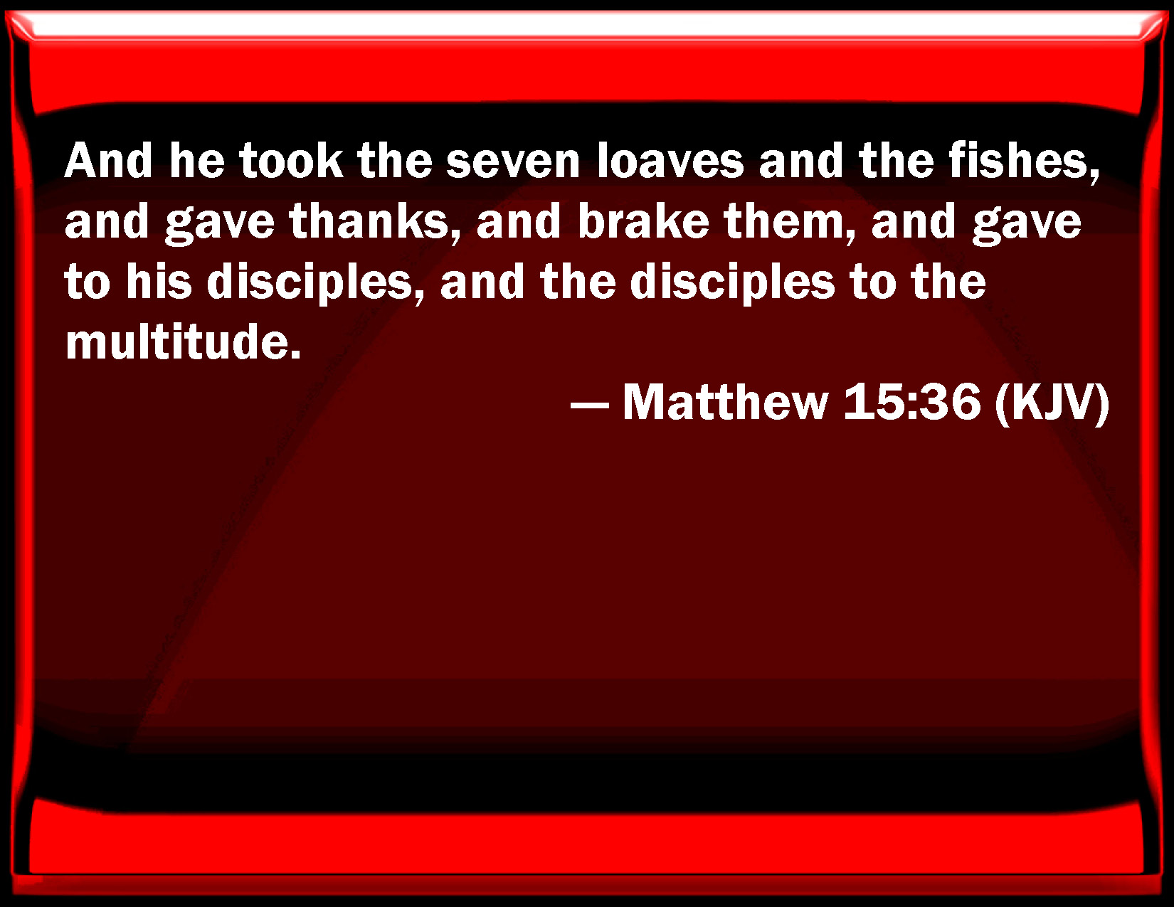 Bible Verse Slide Matthew 15:36 And he took the seven loaves and the fishes, and gave thanks, and broke them, and gave to his disciples, and the disciples to the multitude. KJV: And he took the seven loaves and the fishes, and gave thanks, and brake them, and gave to his disciples, and the disciples to the multitude. DRB: And taking the seven loaves and the fishes, and giving thanks, he brake, and gave to his disciples, and the disciples to the people. DBT: and having taken the seven loaves and the fishes, having given thanks, he broke them and gave them to his disciples, and the disciples to the crowd. ERV: and he took the seven loaves and the fishes; and he gave thanks and brake, and gave to the disciples, and the disciples to the multitudes. WBT: And he took the seven loaves and the fishes, and gave thanks, and broke them, and gave to his disciples, and the disciples to the multitude. WEB: and he took the seven loaves and the fish. He gave thanks and broke them, and gave to the disciples, and the disciples to the multitudes. YLT: and having taken the seven loaves and the fishes, having given thanks, he did break, and gave to his disciples, and the disciples to the multitude.Links Matthew 15:36 NIV • Matthew 15:36 NLT • Matthew 15:36 ESV • Matthew 15:36 NASB • Matthew 15:36 KJV • Matthew 15:36 Interlinear • Matthew 15:36 Commentaries • Matthew 15:36 Parallel Texts • Matthew 15:36 Bible Apps • Matthew 15:36 Parallel • Bible Hub |