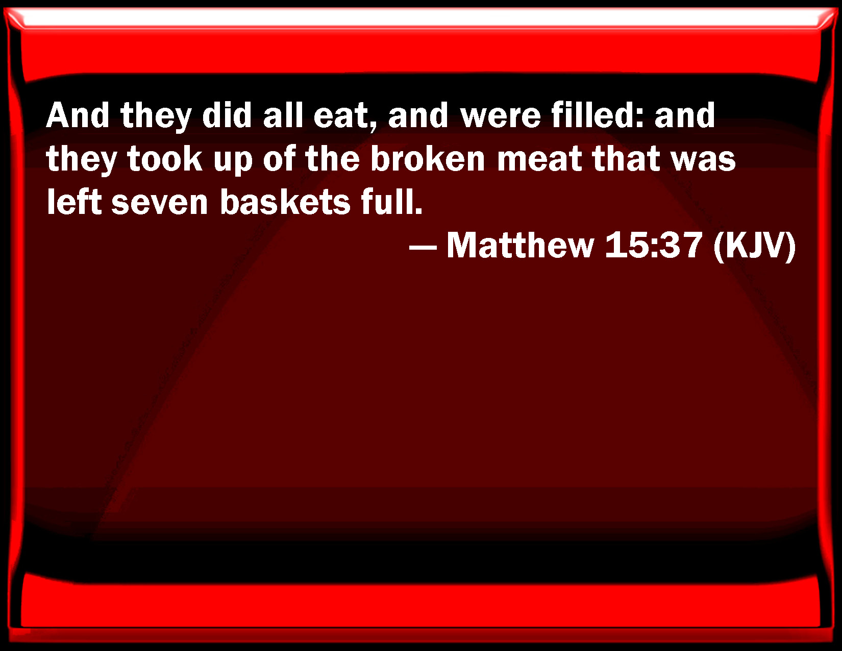 Bible Verse Slide Matthew 15:37 And they did all eat, and were filled: and they took up of the broken meat that was left seven baskets full. KJV: And they did all eat, and were filled: and they took up of the broken meat that was left seven baskets full. DRB: And they did all eat, and had their fill. And they took up seven baskets full, of what remained of the fragments. DBT: And all ate and were filled; and they took up what was over and above of the fragments seven baskets full; ERV: And they did all eat, and were filled: and they took up that which remained over of the broken pieces, seven baskets full. WBT: And they all ate and were filled: and they took up of the fragments that were left seven baskets full. WEB: They all ate, and were filled. They took up seven baskets full of the broken pieces that were left over. YLT: And they did all eat, and were filled, and they took up what was over of the broken pieces seven baskets full,Links Matthew 15:37 NIV • Matthew 15:37 NLT • Matthew 15:37 ESV • Matthew 15:37 NASB • Matthew 15:37 KJV • Matthew 15:37 Interlinear • Matthew 15:37 Commentaries • Matthew 15:37 Parallel Texts • Matthew 15:37 Bible Apps • Matthew 15:37 Parallel • Bible Hub |