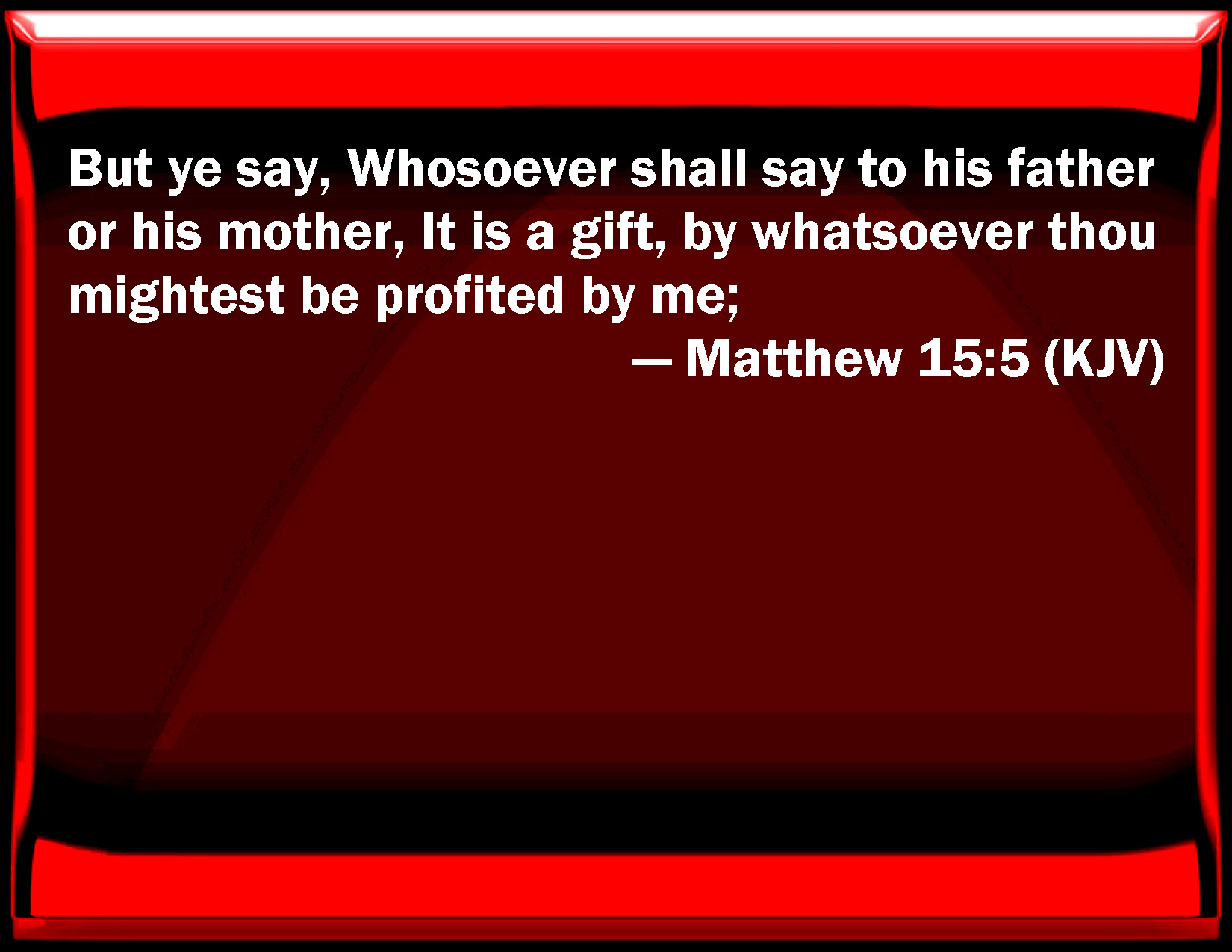 Bible Verse Slide Matthew 15:5 But you say, Whoever shall say to his father or his mother, It is a gift, by whatever you might be profited by me; KJV: But ye say, Whosoever shall say to his father or his mother, It is a gift, by whatsoever thou mightest be profited by me; DRB: But you say: Whosoever shall say to father or mother, The gift whatsoever proceedeth from me, shall profit thee. DBT: But ye say, Whosoever shall say to his father or mother, It is a gift, whatsoever it be by which received from me thou wouldest be profited: ERV: But ye say, Whosoever shall say to his father or his mother, That wherewith thou mightest have been profited by me is given to God; WBT: But ye say, Whoever shall say to his father or his mother, It is a gift, by whatever thou mightest be profited by me; WEB: But you say, 'Whoever may tell his father or his mother, "Whatever help you might otherwise have gotten from me is a gift devoted to God," YLT: but ye say, Whoever may say to father or mother, An offering is whatever thou mayest be profited by me; — Links Matthew 15:5 NIV • Matthew 15:5 NLT • Matthew 15:5 ESV • Matthew 15:5 NASB • Matthew 15:5 KJV • Matthew 15:5 Interlinear • Matthew 15:5 Commentaries • Matthew 15:5 Parallel Texts • Matthew 15:5 Bible Apps • Matthew 15:5 Parallel • Bible Hub |