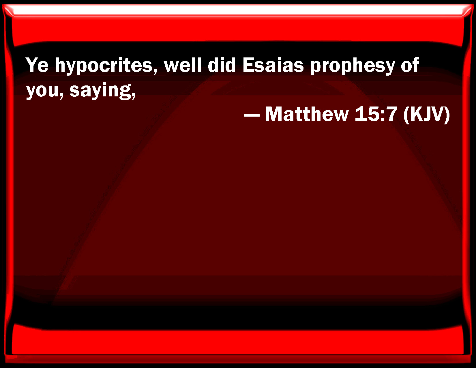 Bible Verse Slide Matthew 15:7 You hypocrites, well did Esaias prophesy of you, saying, KJV: Ye hypocrites, well did Esaias prophesy of you, saying, DRB: Hypocrites, well hath Isaias prophesied of you, saying: DBT: Hypocrites! well has Esaias prophesied about you, saying, ERV: Ye hypocrites, well did Isaiah prophesy of you, saying, WBT: Ye hypocrites, well did Isaiah prophesy of you, saying, WEB: You hypocrites! Well did Isaiah prophesy of you, saying, YLT: 'Hypocrites, well did Isaiah prophesy of you, saying,Links Matthew 15:7 NIV • Matthew 15:7 NLT • Matthew 15:7 ESV • Matthew 15:7 NASB • Matthew 15:7 KJV • Matthew 15:7 Interlinear • Matthew 15:7 Commentaries • Matthew 15:7 Parallel Texts • Matthew 15:7 Bible Apps • Matthew 15:7 Parallel • Bible Hub |