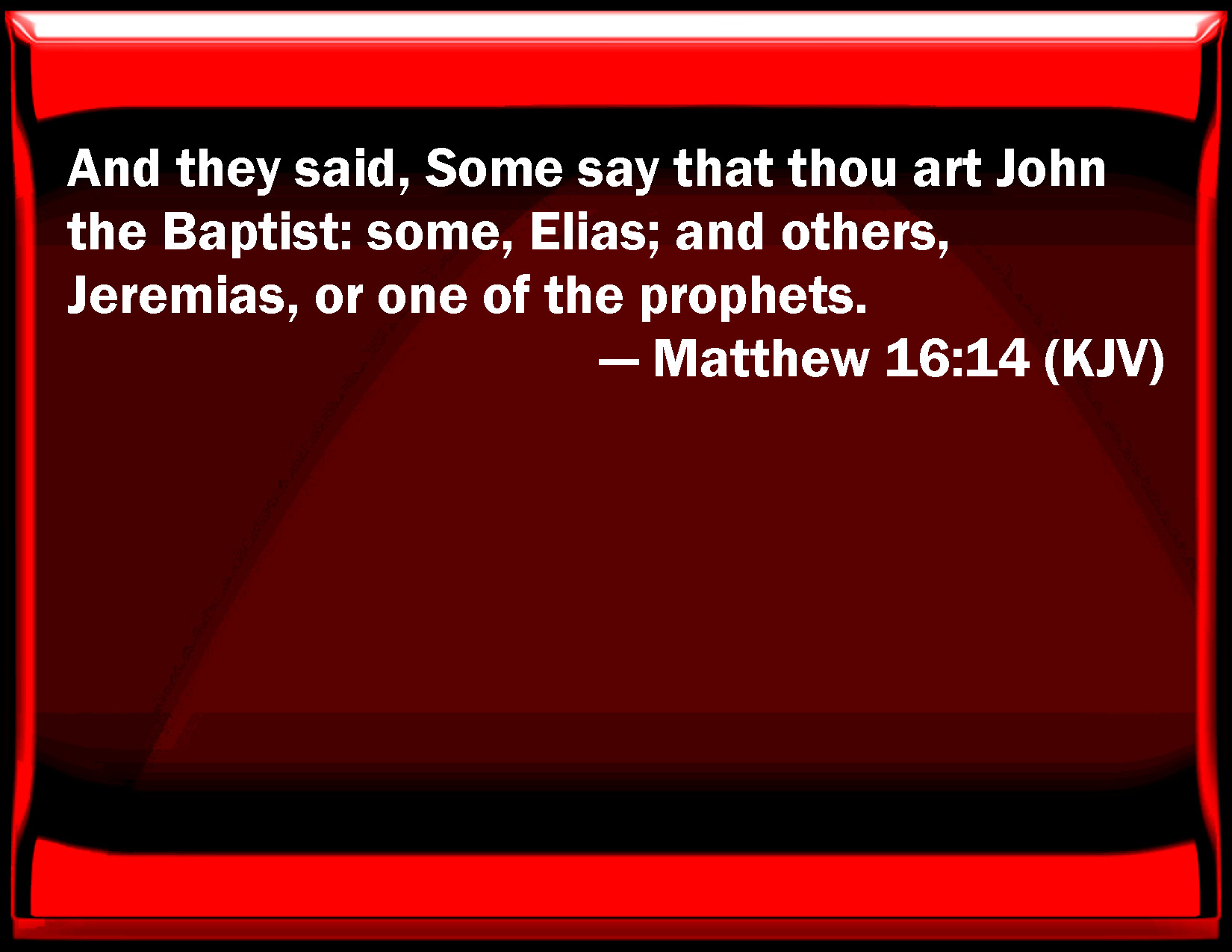 Bible Verse Slide Matthew 16:14 And they said, Some say that you are John the Baptist: some, Elias; and others, Jeremias, or one of the prophets. KJV: And they said, Some say that thou art John the Baptist: some, Elias; and others, Jeremias, or one of the prophets. DRB: But they said: Some John the Baptist, and other some Elias, and others Jeremias, or one of the prophets. DBT: And they said, Some, John the baptist; and others, Elias; and others again, Jeremias or one of the prophets. ERV: And they said, Some say John the Baptist; some, Elijah: and others, Jeremiah, or one of the prophets. WBT: And they said, Some say that thou art John the Baptist: some Elijah; and others, Jeremiah, or one of the prophets. WEB: They said, "Some say John the Baptizer, some, Elijah, and others, Jeremiah, or one of the prophets." YLT: and they said, 'Some, John the Baptist, and others, Elijah, and others, Jeremiah, or one of the prophets.'Links Matthew 16:14 NIV • Matthew 16:14 NLT • Matthew 16:14 ESV • Matthew 16:14 NASB • Matthew 16:14 KJV • Matthew 16:14 Interlinear • Matthew 16:14 Commentaries • Matthew 16:14 Parallel Texts • Matthew 16:14 Bible Apps • Matthew 16:14 Parallel • Bible Hub |