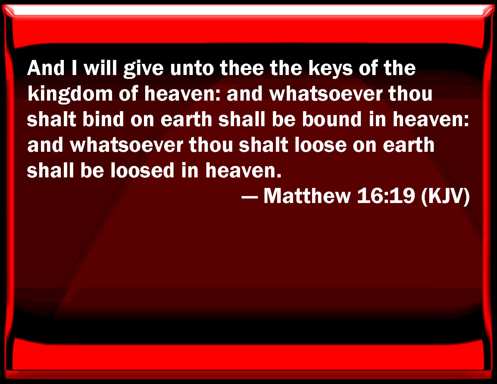 And I will give to thee the keys of the kingdom of heaven. And whatsoever thou shalt bind upon earth, it shall be bound also in heaven: and whatsoever thou shalt loose upon earth, it shall be loosed also in heaven.