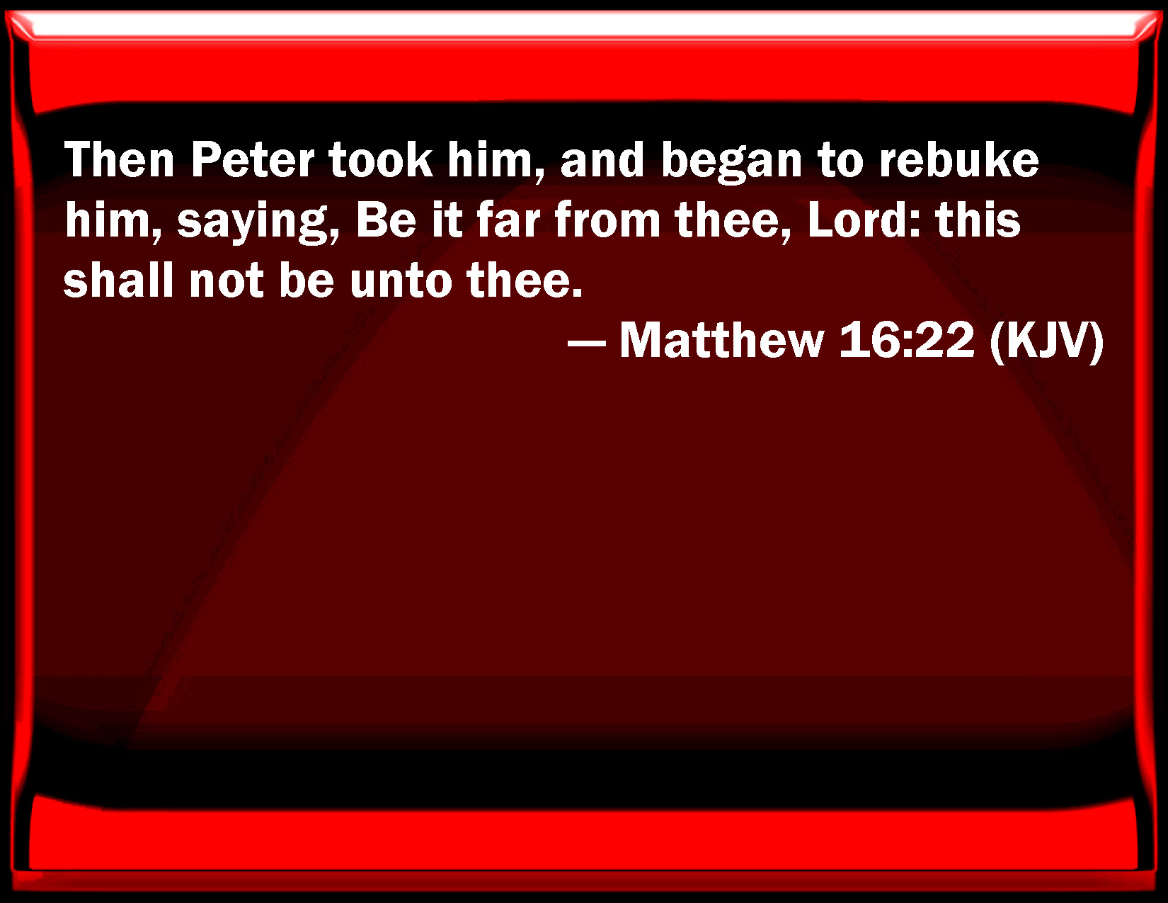Bible Verse Slide Matthew 16:22 Then Peter took him, and began to rebuke him, saying, Be it far from you, Lord: this shall not be to you. KJV: Then Peter took him, and began to rebuke him, saying, Be it far from thee, Lord: this shall not be unto thee. DRB: And Peter taking him, began to rebuke him, saying: Lord, be it far from thee, this shall not be unto thee. DBT: And Peter taking him to him began to rebuke him, saying, God be favourable to thee, Lord; this shall in no wise be unto thee. ERV: And Peter took him, and began to rebuke him, saying, Be it far from thee, Lord: this shall never be unto thee. WBT: Then Peter took him, and began to rebuke him, saying, Be it far from thee, Lord: this shall not be to thee. WEB: Peter took him aside, and began to rebuke him, saying, "Far be it from you, Lord! This will never be done to you." YLT: And having taken him aside, Peter began to rebuke him, saying, 'Be kind to thyself, sir; this shall not be to thee;'Links Matthew 16:22 NIV • Matthew 16:22 NLT • Matthew 16:22 ESV • Matthew 16:22 NASB • Matthew 16:22 KJV • Matthew 16:22 Interlinear • Matthew 16:22 Commentaries • Matthew 16:22 Parallel Texts • Matthew 16:22 Bible Apps • Matthew 16:22 Parallel • Bible Hub |
