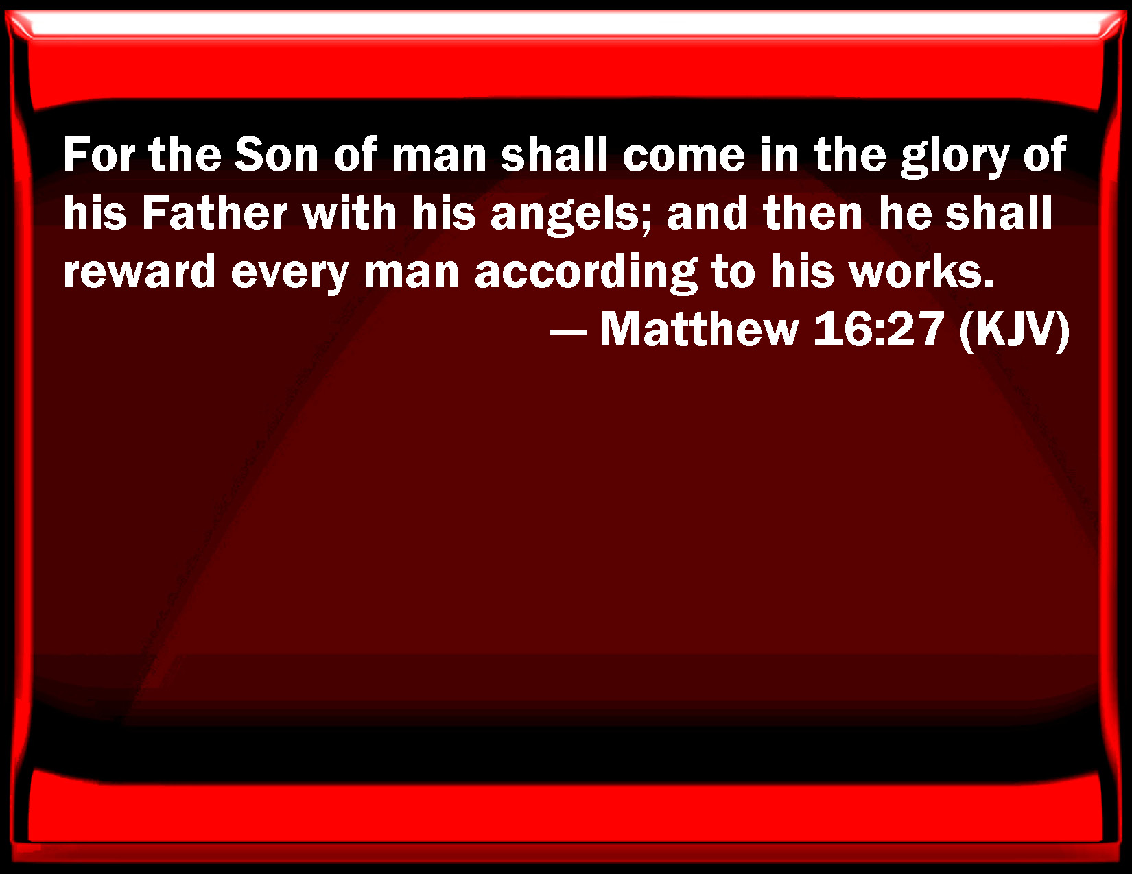 Matthew 16:27 For the Son of man shall come in the glory of his Father with his angels; and then he shall reward every man according to his works.