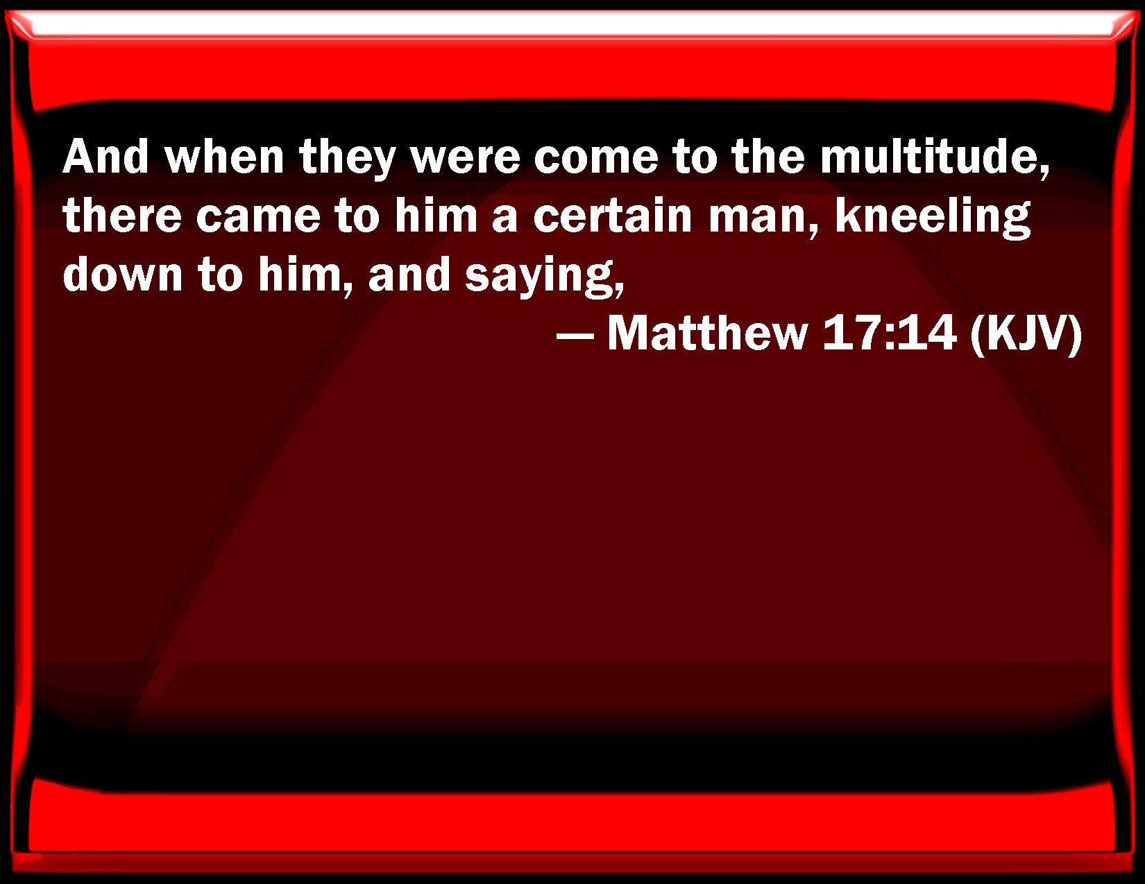Bible Verse Slide Matthew 17:14 And when they were come to the multitude, there came to him a certain man, kneeling down to him, and saying, KJV: And when they were come to the multitude, there came to him a certain man, kneeling down to him, and saying, DRB: And when he was come to the multitude, there came to him a man falling down on his knees before him, saying: DBT: And when they came to the crowd, a man came to him, falling on his knees before him, and saying, ERV: And when they were come to the multitude, there came to him a man, kneeling to him, and saying, WBT: And when they had come to the multitude, there came to him a certain man kneeling down to him, and saying, WEB: When they came to the multitude, a man came to him, kneeling down to him, saying, YLT: And when they came unto the multitude, there came to him a man, kneeling down to him,Links Matthew 17:14 NIV • Matthew 17:14 NLT • Matthew 17:14 ESV • Matthew 17:14 NASB • Matthew 17:14 KJV • Matthew 17:14 Interlinear • Matthew 17:14 Commentaries • Matthew 17:14 Parallel Texts • Matthew 17:14 Bible Apps • Matthew 17:14 Parallel • Bible Hub |
