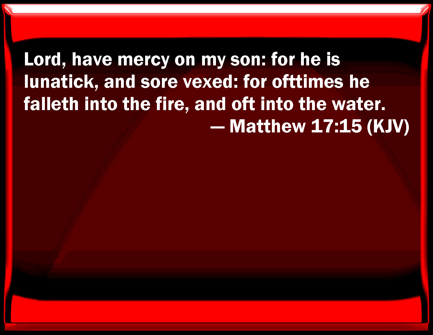 Bible Verse Slide Matthew 17:15 Lord, have mercy on my son: for he is lunatic, and sore vexed: for often he falls into the fire, and oft into the water. KJV: Lord, have mercy on my son: for he is lunatick, and sore vexed: for ofttimes he falleth into the fire, and oft into the water. DRB: Lord, have pity on my son, for he is a lunatic, and suffereth much: for he falleth often into the fire, and often into the water. DBT: Lord, have mercy on my son, for he is lunatic, and suffers sorely; for often he falls into the fire and often into the water. ERV: Lord, have mercy on my son: for he is epileptic, and suffereth grievously: for oft-times he falleth into the fire, and oft-times into the water. WBT: Lord, have mercy on my son; for he is lunatic, and grievously distressed; for often he falleth into the fire, and often into the water. WEB: "Lord, have mercy on my son, for he is epileptic, and suffers grievously; for he often falls into the fire, and often into the water. YLT: and saying, 'Sir, deal kindly with my son, for he is lunatic, and doth suffer miserably, for often he doth fall into the fire, and often into the water,Links Matthew 17:15 NIV • Matthew 17:15 NLT • Matthew 17:15 ESV • Matthew 17:15 NASB • Matthew 17:15 KJV • Matthew 17:15 Interlinear • Matthew 17:15 Commentaries • Matthew 17:15 Parallel Texts • Matthew 17:15 Bible Apps • Matthew 17:15 Parallel • Bible Hub |