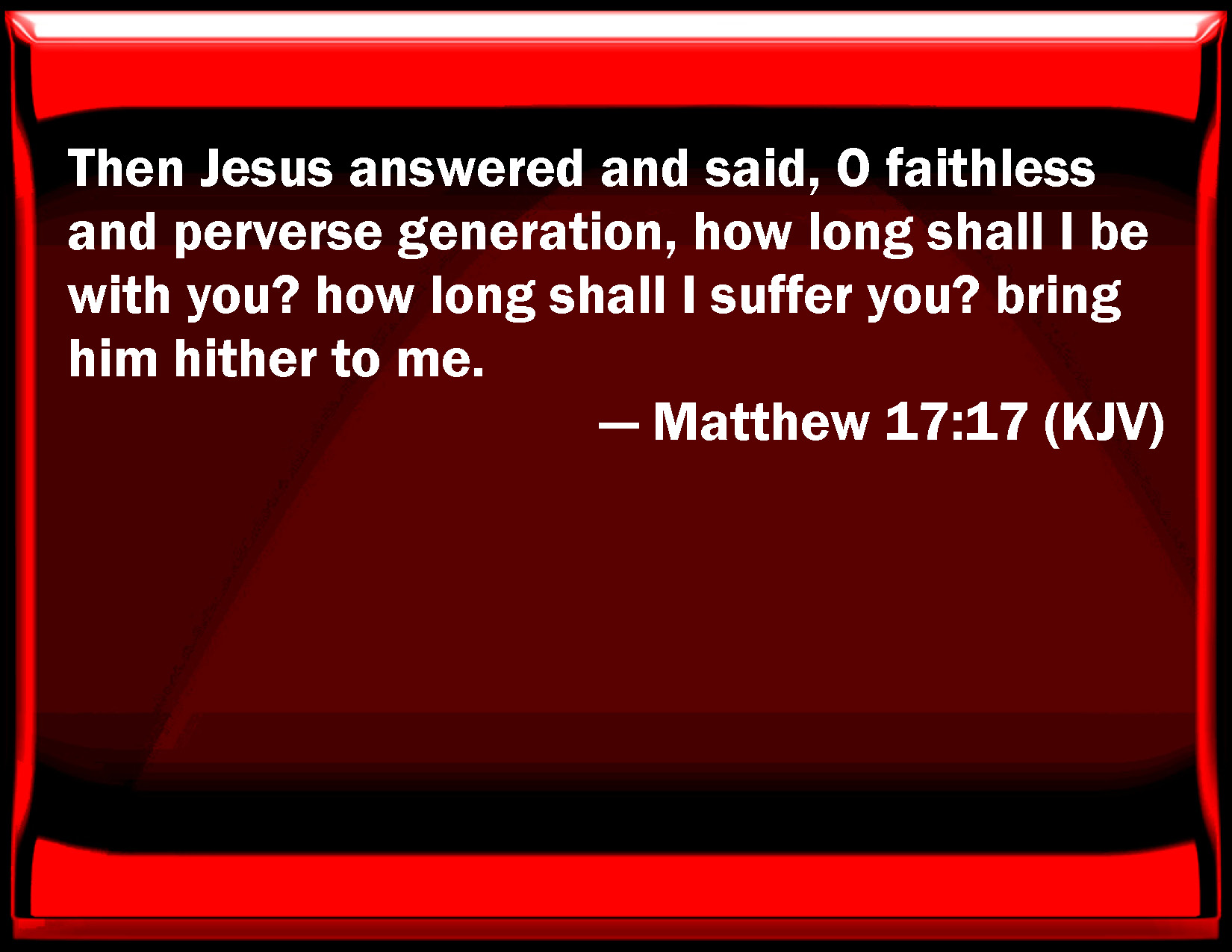 Bible Verse Slide Matthew 17:17 Then Jesus answered and said, O faithless and perverse generation, how long shall I be with you? how long shall I suffer you? bring him here to me. KJV: Then Jesus answered and said, O faithless and perverse generation, how long shall I be with you? how long shall I suffer you? bring him hither to me. DRB: Then Jesus answered and said: O unbelieving and perverse generation, how long shall I be with you? How long shall I suffer you? bring him hither to me. DBT: And Jesus answering said, O unbelieving and perverted generation, how long shall I be with you? how long shall I bear with you? Bring him here to me. ERV: And Jesus answered and said, O faithless and perverse generation, how long shall I be with you? how long shall I bear with you? bring him hither to me. WBT: Then Jesus answered and said, O faithless and perverse generation, how long shall I be with you? how long shall I suffer you? bring him hither to me. WEB: Jesus answered, "Faithless and perverse generation! How long will I be with you? How long will I bear with you? Bring him here to me." YLT: And Jesus answering said, 'O generation, unstedfast and perverse, till when shall I be with you? till when shall I bear you? bring him to me hither;'Links Matthew 17:17 NIV • Matthew 17:17 NLT • Matthew 17:17 ESV • Matthew 17:17 NASB • Matthew 17:17 KJV • Matthew 17:17 Interlinear • Matthew 17:17 Commentaries • Matthew 17:17 Parallel Texts • Matthew 17:17 Bible Apps • Matthew 17:17 Parallel • Bible Hub |
