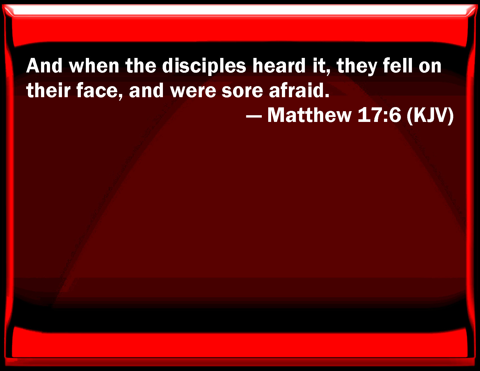 Bible Verse Slide Matthew 17:6 And when the disciples heard it, they fell on their face, and were sore afraid. KJV: And when the disciples heard it, they fell on their face, and were sore afraid. DRB: And the disciples hearing, fell upon their face, and were very much afraid. DBT: And the disciples hearing it fell upon their faces, and were greatly terrified. ERV: And when the disciples heard it, they fell on their face, and were sore afraid. WBT: And when the disciples heard it, they fell on their face, and were in great fear. WEB: When the disciples heard it, they fell on their faces, and were very afraid. YLT: And the disciples having heard, did fall upon their face, and were exceedingly afraid,Links Matthew 17:6 NIV • Matthew 17:6 NLT • Matthew 17:6 ESV • Matthew 17:6 NASB • Matthew 17:6 KJV • Matthew 17:6 Interlinear • Matthew 17:6 Commentaries • Matthew 17:6 Parallel Texts • Matthew 17:6 Bible Apps • Matthew 17:6 Parallel • Bible Hub |
