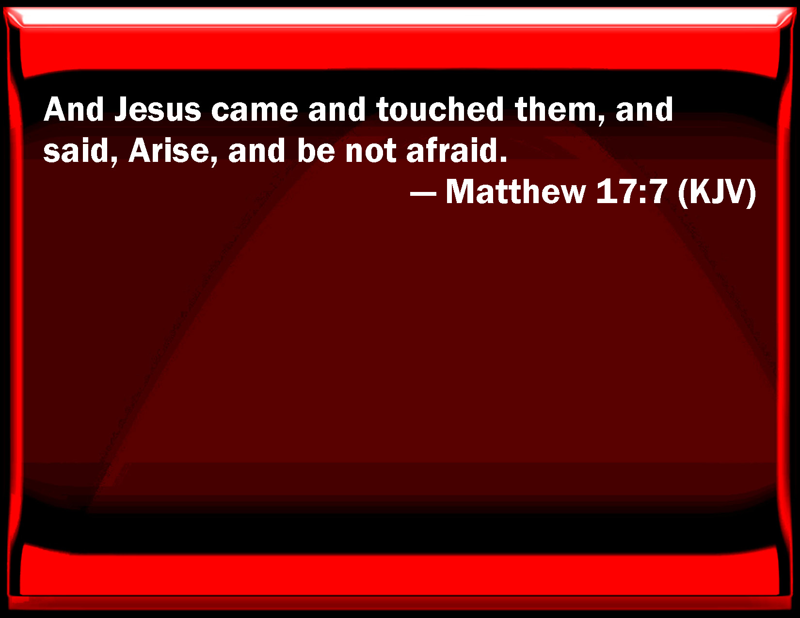 Bible Verse Slide Matthew 17:7 And Jesus came and touched them, and said, Arise, and be not afraid. KJV: And Jesus came and touched them, and said, Arise, and be not afraid. DRB: And Jesus came and touched them: and said to them, Arise, and fear not. DBT: And Jesus coming to them touched them, and said, Rise up, and be not terrified. ERV: And Jesus came and touched them and said, Arise, and be not afraid. WBT: And Jesus came and touched them, and said, Arise, and be not afraid. WEB: Jesus came and touched them and said, "Get up, and don't be afraid." YLT: and Jesus having come near, touched them, and said, 'Rise, be not afraid,'Links Matthew 17:7 NIV • Matthew 17:7 NLT • Matthew 17:7 ESV • Matthew 17:7 NASB • Matthew 17:7 KJV • Matthew 17:7 Interlinear • Matthew 17:7 Commentaries • Matthew 17:7 Parallel Texts • Matthew 17:7 Bible Apps • Matthew 17:7 Parallel • Bible Hub |