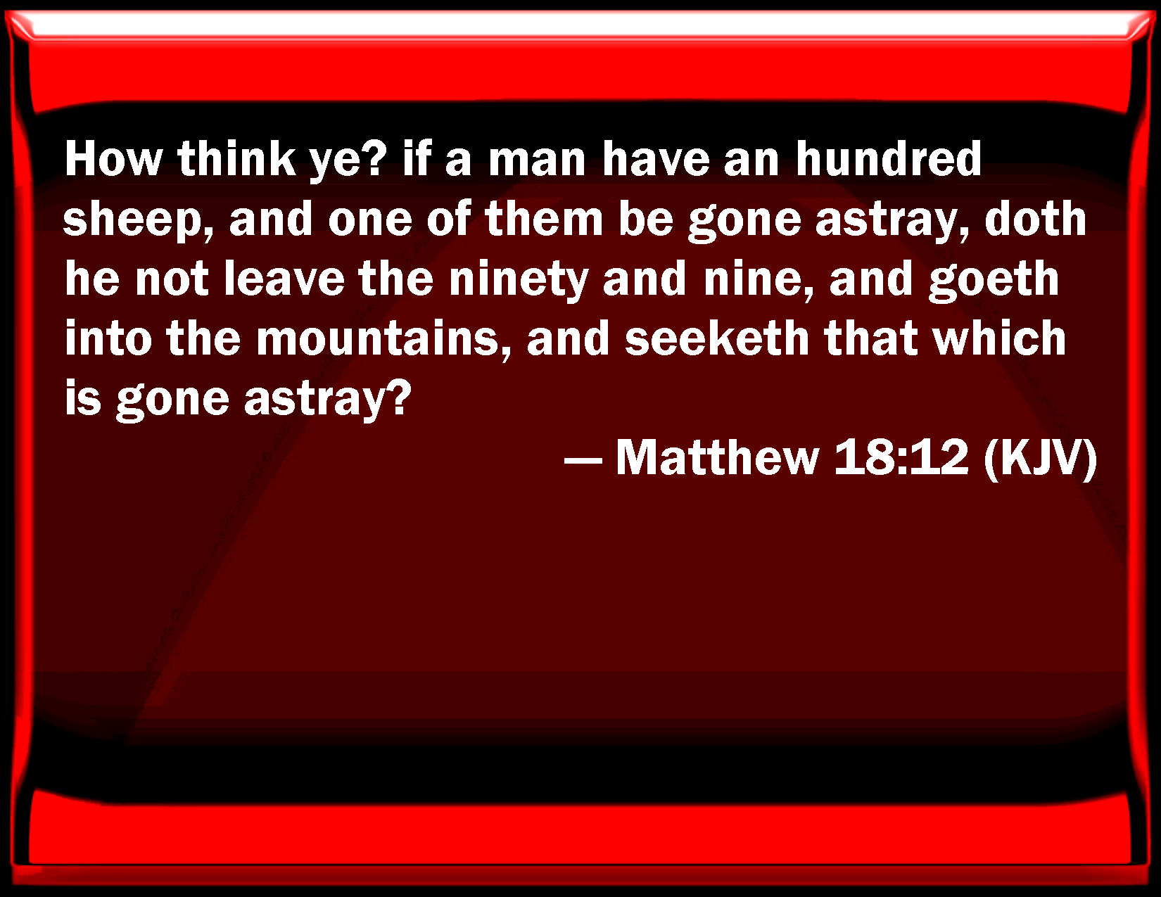 Bible Verse Slide Matthew 18:12 How think you? if a man have an hundred sheep, and one of them be gone astray, does he not leave the ninety and nine, and goes into the mountains, and seeks that which is gone astray? KJV: How think ye? if a man have an hundred sheep, and one of them be gone astray, doth he not leave the ninety and nine, and goeth into the mountains, and seeketh that which is gone astray? DRB: What think you? If a man have an hundred sheep, and one of them should go astray: doth he not leave the ninety-nine in the mountains, and go to seek that which is gone astray? DBT: What think ye? If a certain man should have a hundred sheep, and one of them be gone astray, does he not, leaving the ninety and nine on the mountains, go and seek the one that has gone astray? ERV: How think ye? if any man have a hundred sheep, and one of them be gone astray, doth he not leave the ninety and nine, and go unto the mountains, and seek that which goeth astray? WBT: How think ye? if a man hath a hundred sheep, and one of them is gone astray, doth he not leave the ninety and nine, and go to the mountains, and seek that which is gone astray? WEB: "What do you think? If a man has one hundred sheep, and one of them goes astray, doesn't he leave the ninety-nine, go to the mountains, and seek that which has gone astray? YLT: What think ye? if a man may have an hundred sheep, and there may go astray one of them, doth he not — having left the ninety-nine, having gone on the mountains — seek that which is gone astray?Links Matthew 18:12 NIV • Matthew 18:12 NLT • Matthew 18:12 ESV • Matthew 18:12 NASB • Matthew 18:12 KJV • Matthew 18:12 Interlinear • Matthew 18:12 Commentaries • Matthew 18:12 Parallel Texts • Matthew 18:12 Bible Apps • Matthew 18:12 Parallel • Bible Hub |